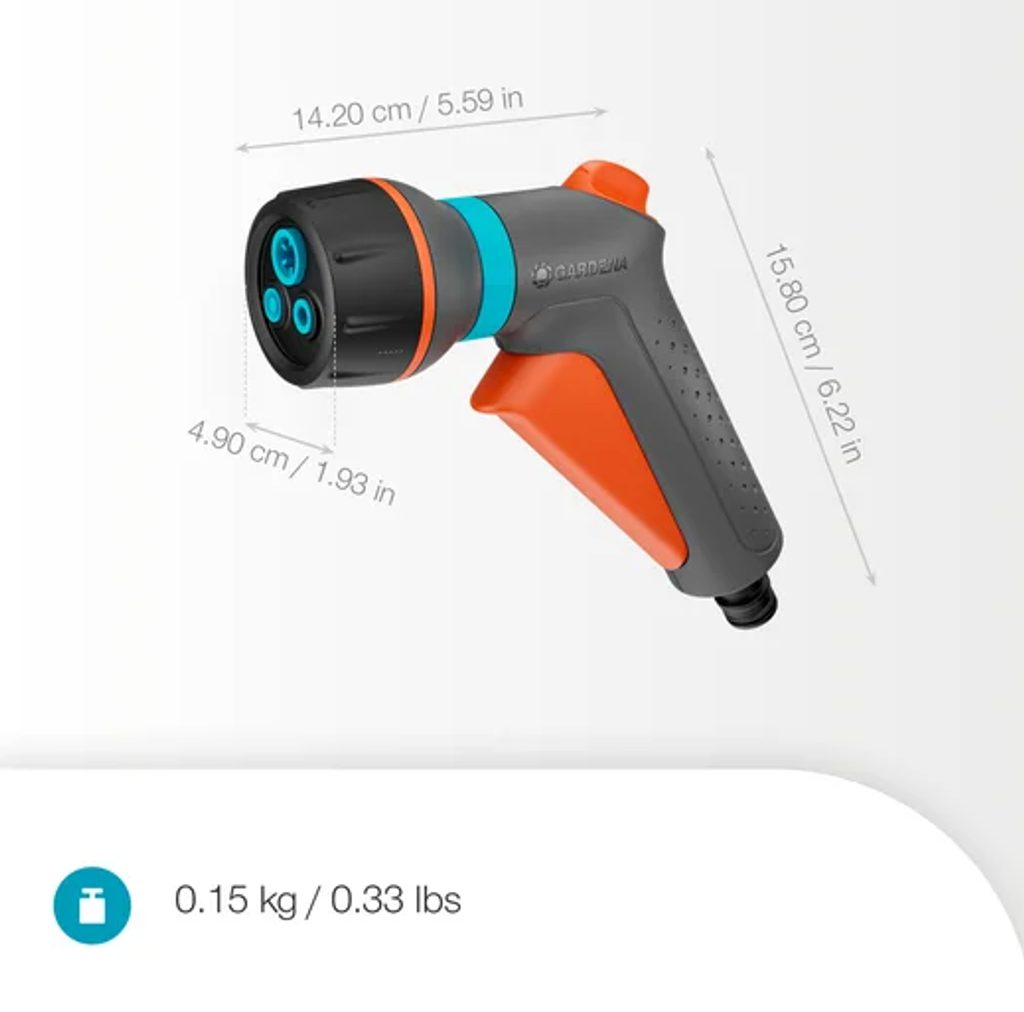 Promyšlený design nabízí tři univerzální režimy rozstřiku, které snadno přepnete podle aktuální potřeby: měkký kuželový proud šetrně ošetří citlivé rostliny, silný proud si poradí s nečistotami při úklidu a objemový proud zajistí účinné zalévání květináčů.