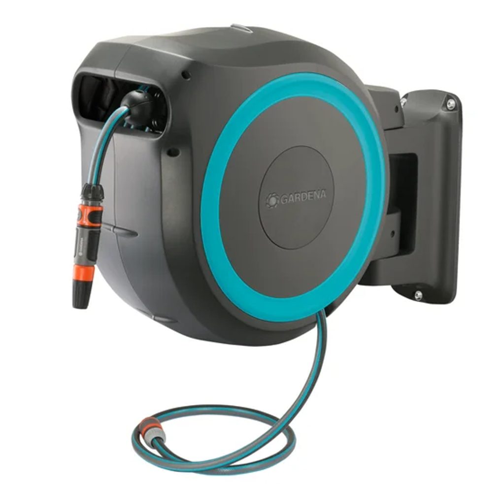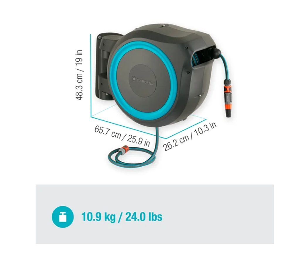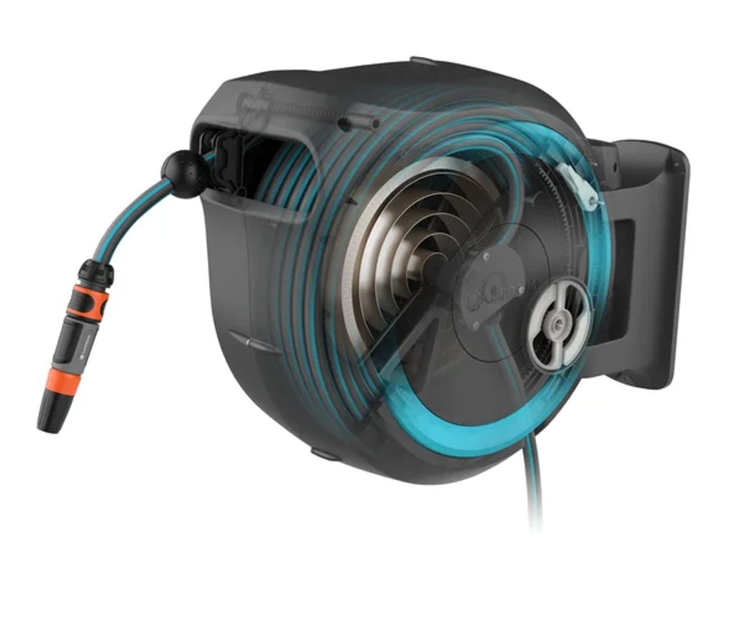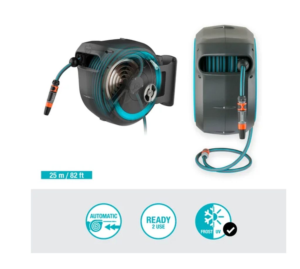 Box je vybaven otočným držákem o 180°, takže se pohodlně dostanete do každého kouta zahrady. S 25-ti metrovou hadicí máte dostatečný dosah i pro větší pozemky. Krátké uzamykací body zajistí, že hadice zůstane vždy přesně tam, kde ji potřebujete, a plynulé navíjení s technologií RollControl chrání hadici i okolí před nechtěným poškozením.