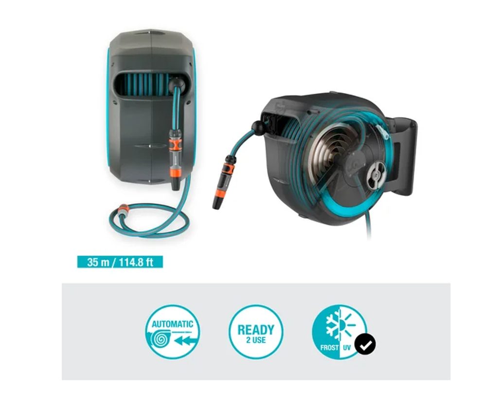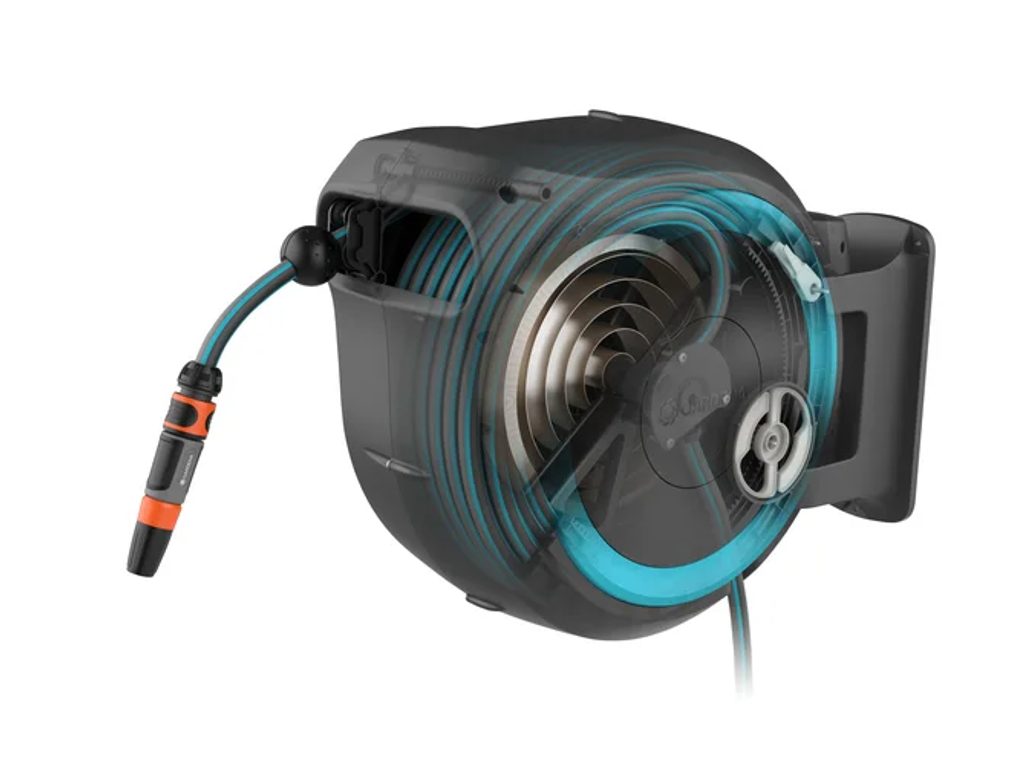 Po dokončení práce nemusíte hadici navíjet, ohýbat se, ani si špinit ruce. Pouhým lehkým zatažením za konec hadice uvolníte zámek a aktivujete zabudovanou ocelovou pružinu. Ta vám hadici automaticky, spolehlivě a rovnoměrně navine. Inovativní technologie Roll Control zajišťuje při navíjení bezpečnost a kontrolu, zatímco integrovaná vodící cívka úhlednost a rovnoměrnost.