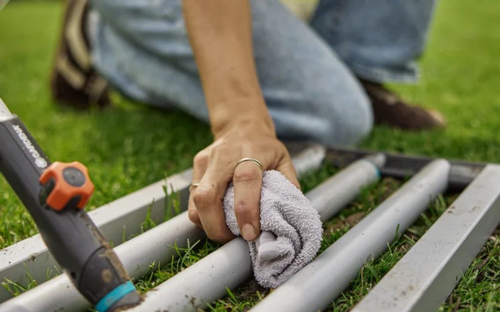 Brána je kompatibilní se systémem GARDENA combisystem a lze ji použít se všemi násadami combisystem – od dřevěných po teleskopické, takže si snadno zvolíte délku podle svých potřeb. Po dokončení práce oceníte i jednoduché čištění: uzavřené panely omezují ulpívání nečistot, takže bránu rychle očistíte bez zdlouhavého drhnutí a můžete si už jen užívat krásně rovný trávník.