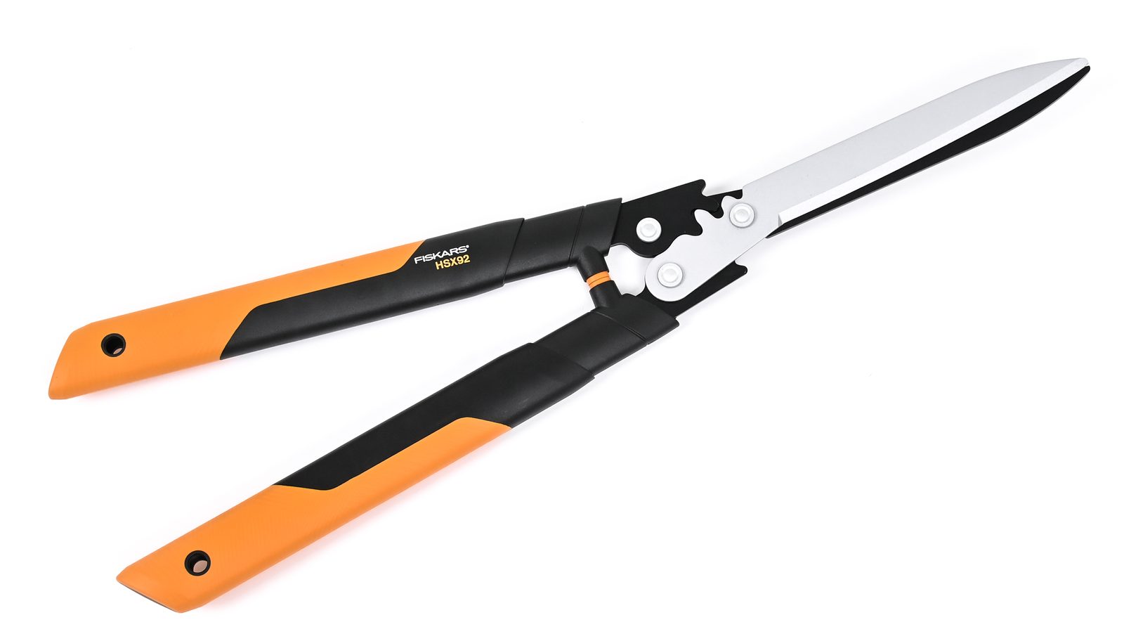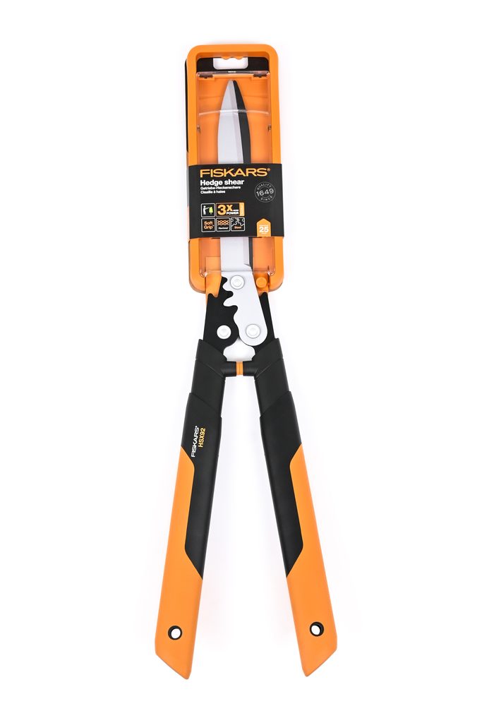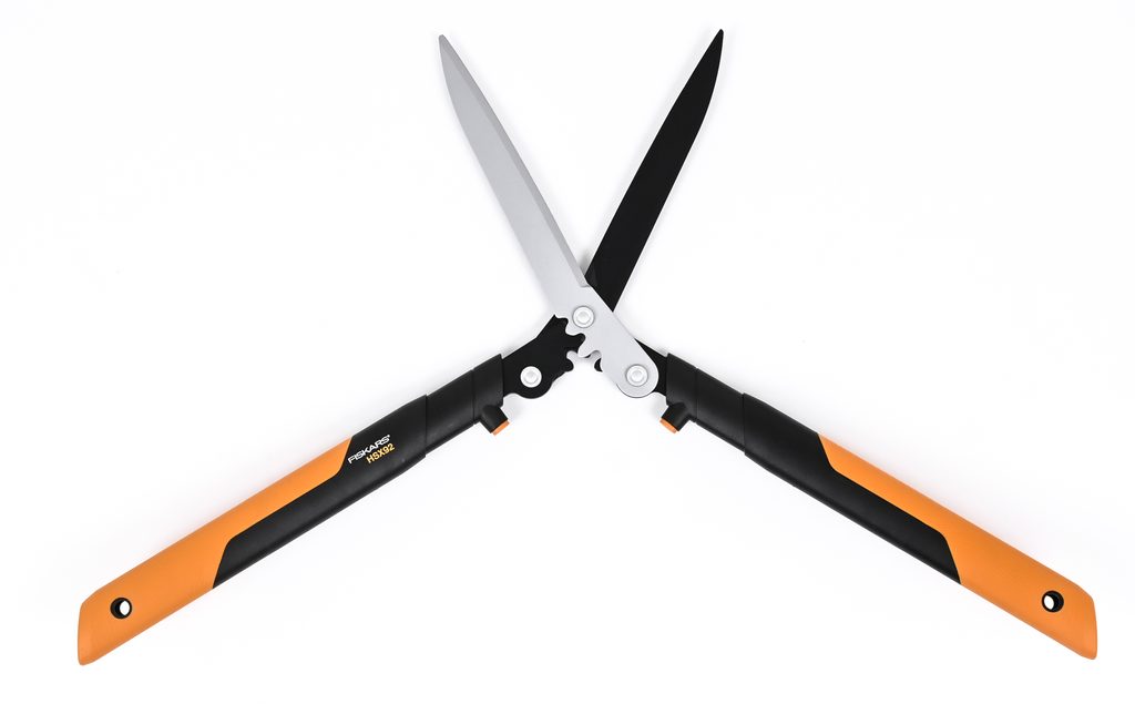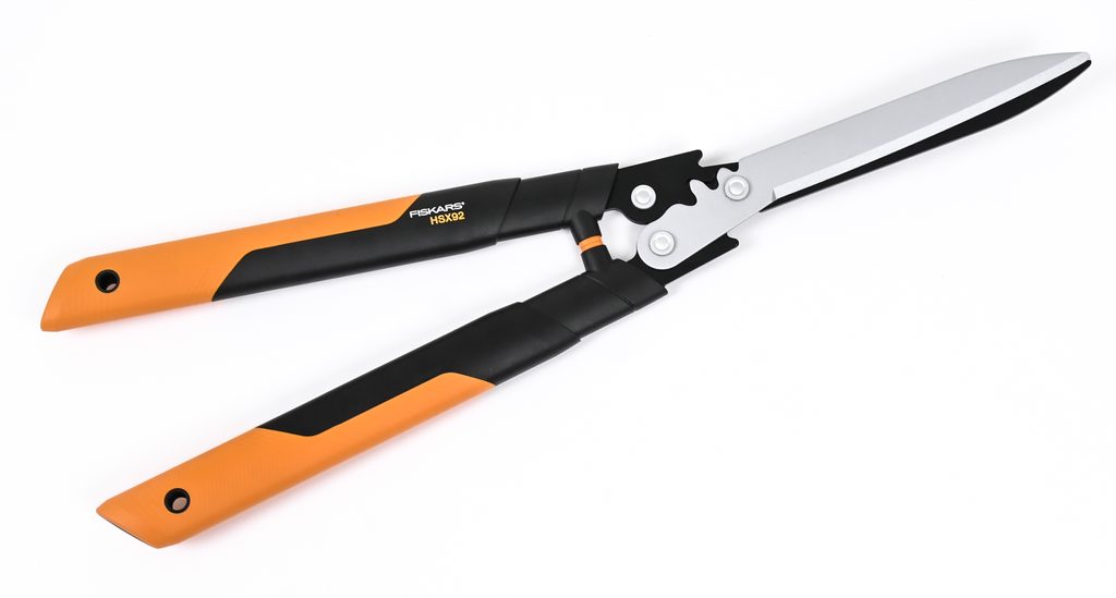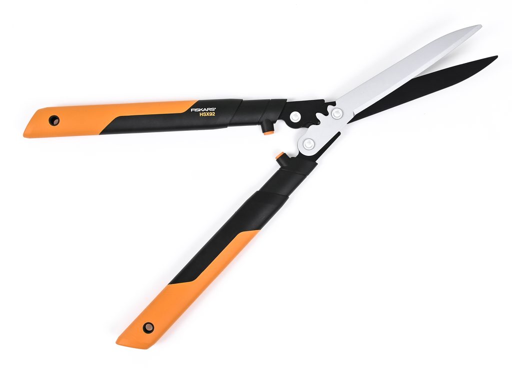 Nůžky na živý plot Fiskars PowerGear™ X HSX92 s oboustranným převodem pro snadné zastřihávání živých plotů a keřů.