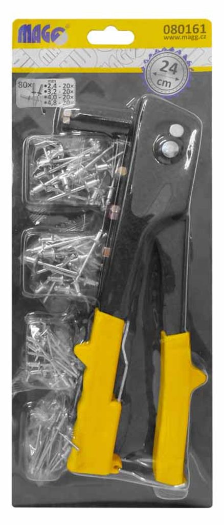 Nýtovací kleště MAGG 080161 jsou praktickým nářadím pro spojování materiálů pomocí nýtů. Tento model přichází s 80 kusy hliníkových nýtů různých velikostí, což zaručuje široké možnosti použití. Kleště mají délku 240 mm, což poskytuje dostatečnou páku pro snadné a efektivní nýtování. Jsou vhodné pro použití v dílnách i pro domácí kutily.