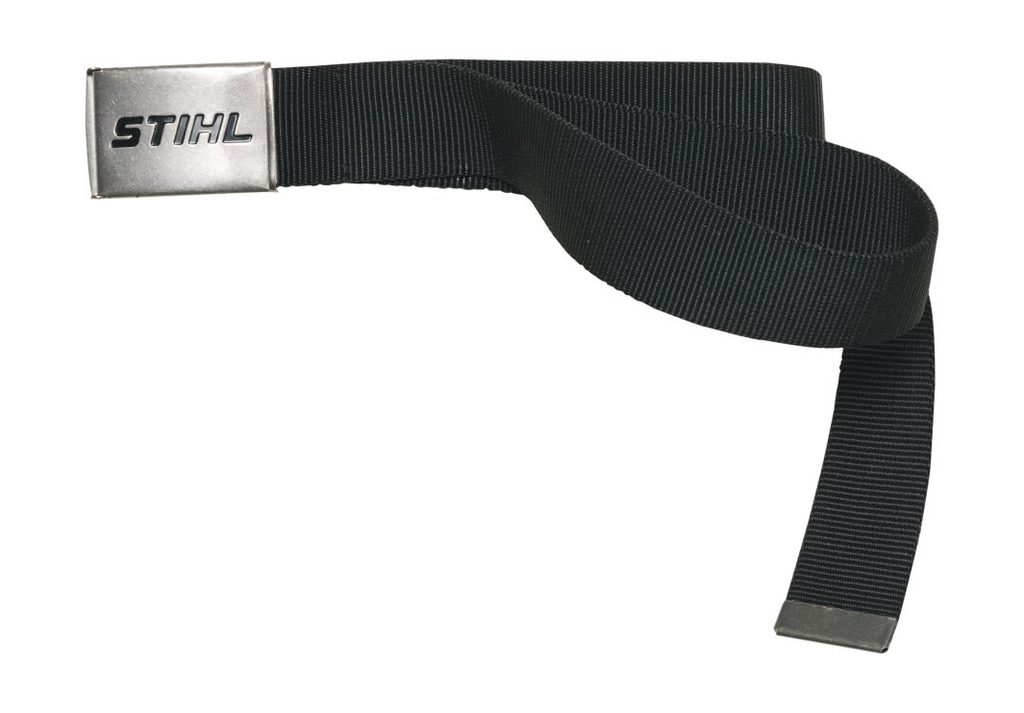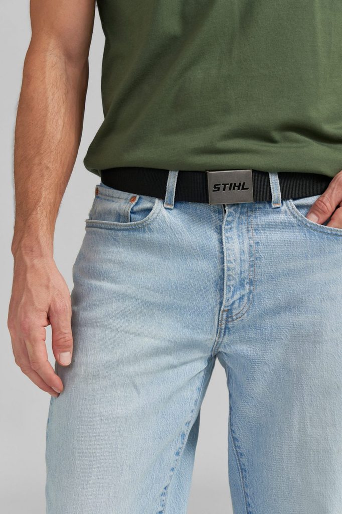 Na kovové sponě opasku se skví logo STIHL, které dodává tomuto praktickému doplňku stylový akcent. Díky upínacímu mechanismu lze snadno nastavit délku opasku podle potřeby.