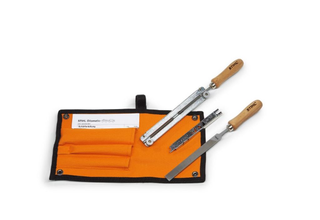 Vícedílná, osvědčená ostřící souprava v robustní brašně s uchycením na opasku. Držák pilníku s kulatým pilníkem. Plochý pilník k úpravě omezovače hloubky. Plochý pilník ke kontrole náběhového úhlu ostří a úhlu ostří, délky zubů a také vzdálenosti omezovače hloubky.