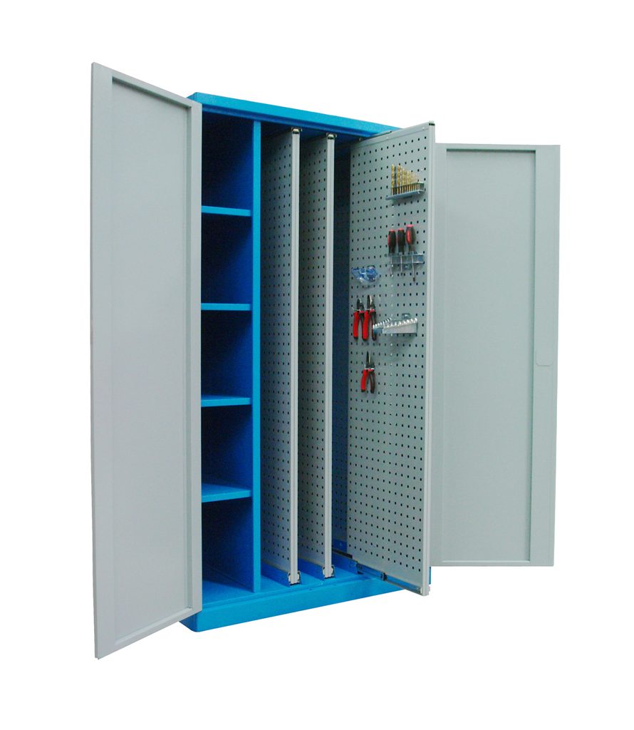 Kovová skříň na nářadí se čtyřmi výsuvnými panely, určená k využití v servisních dílnách, výrobních provozech apod.