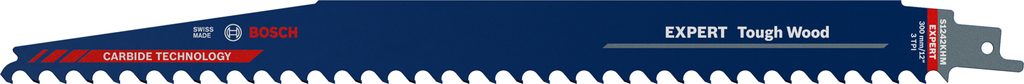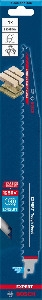 Pilový plátek Bosch Tough Wood S 1242 KHM výkonnostní třídy EXPERT je navržený pro efektivní řezání houževnatého dřeva, které běžně poškozuje pilové listy. Ideální je pro práci s mokrým řezivem, silnými tlakově ošetřenými prkny a sukovitými, živými kořeny či silnými větvemi.