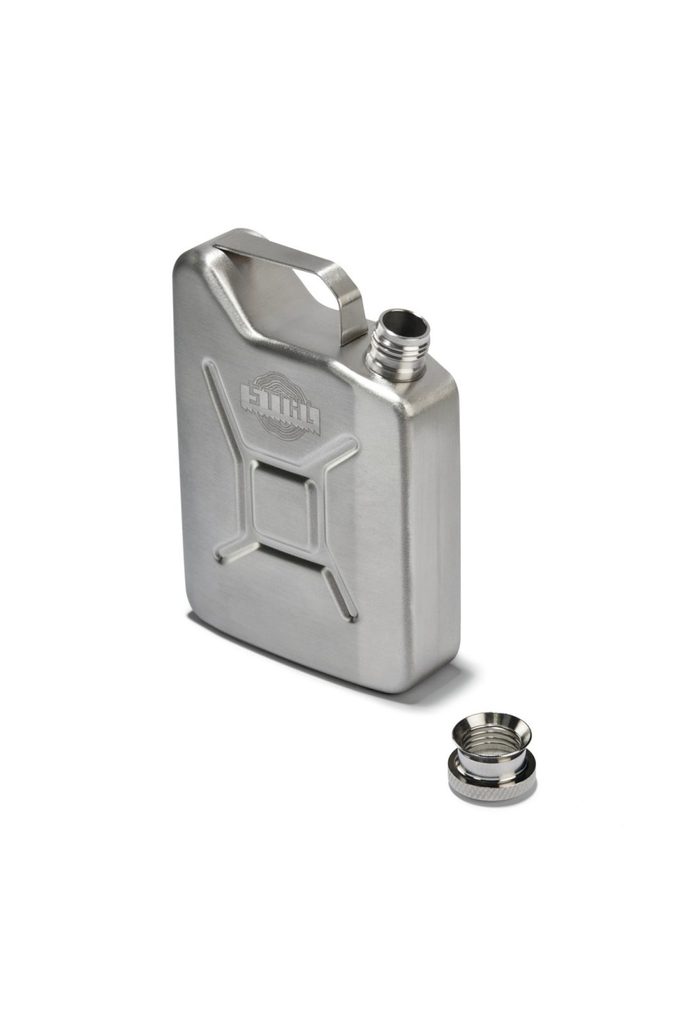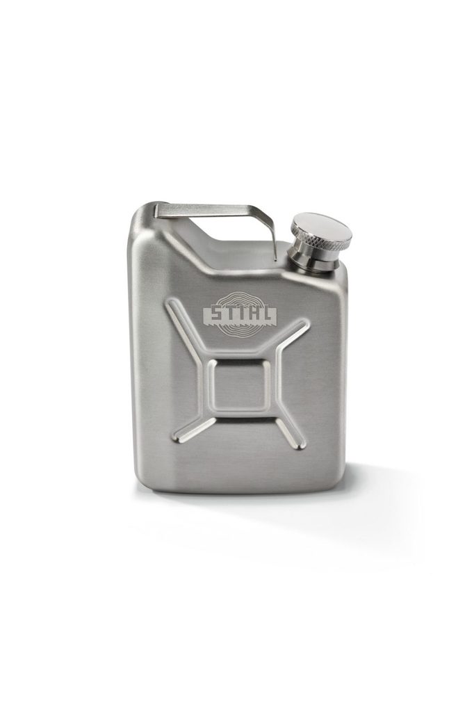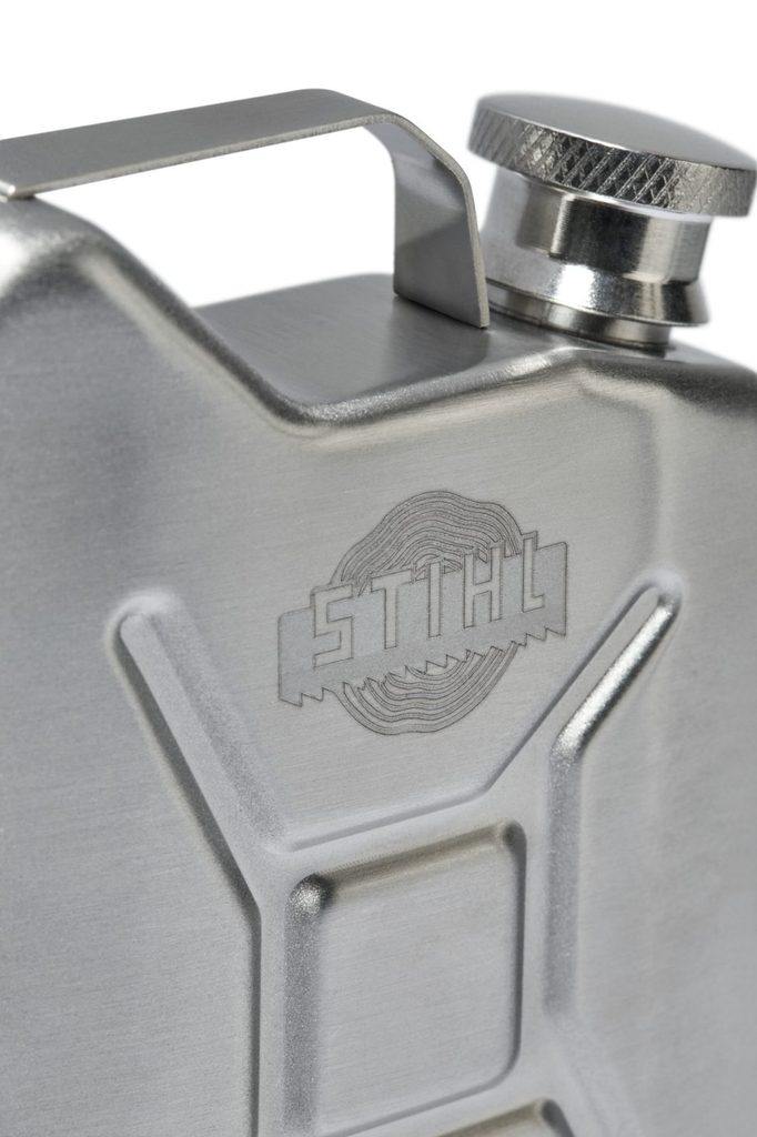 Stylová placatka z nerezové oceli ve tvaru kanystru, zdobená historickým logem STIHL, nabízí elegantní a praktické řešení pro přenášení vašich oblíbených nápojů. S objemem přibližně 125 ml je ideální pro přenos menšího množství vašeho oblíbeného nápoje.