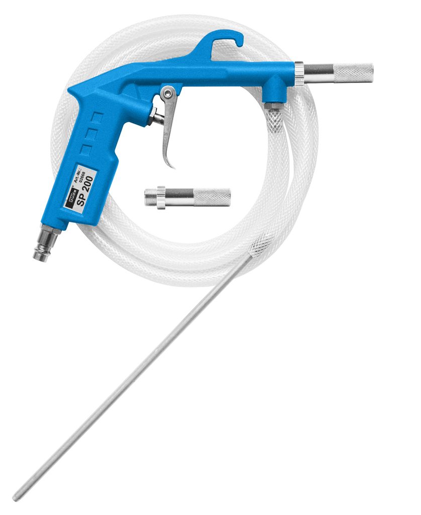 Jednou z klíčových vlastností této pistole je 2 metry dlouhá sací hadice vybavená injektorem. Tato hadice umožňuje přímé nasávání tryskacího materiálu z externích zásobníků nebo pytlů, což zvyšuje pohodlí a efektivitu práce, protože není nutné opakovaně doplňovat materiál manuálně.