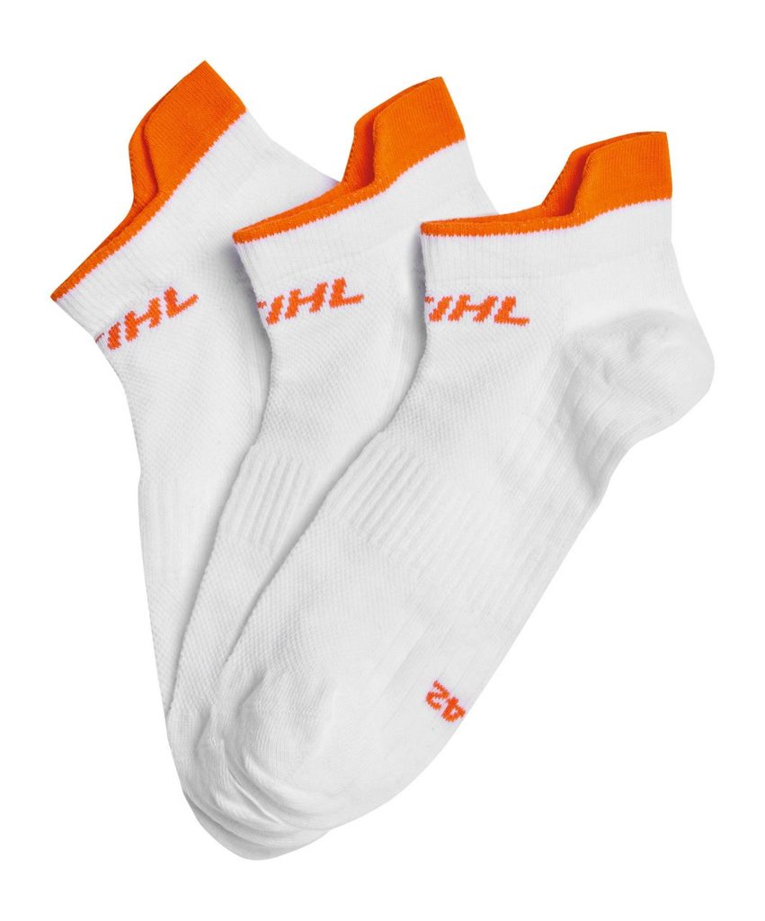 Ponožky STIHL SNEAKER jsou vyrobené z lehké směsi materiálů, tyto ponožky zaručují příjemné klima v botách i během horkých letních dnů. Díky inovativnímu designu s pleteným logem STIHL na přední straně nejen skvěle vypadají, ale jsou také praktické – každá ponožka je označena jako "pravá" nebo "levá", což usnadňuje jejich nošení a zajišťuje perfektní padnutí. Velikost je jasně uvedena na chodidle, takže už nikdy nebudete muset tápat, která ponožka je ta správná.
