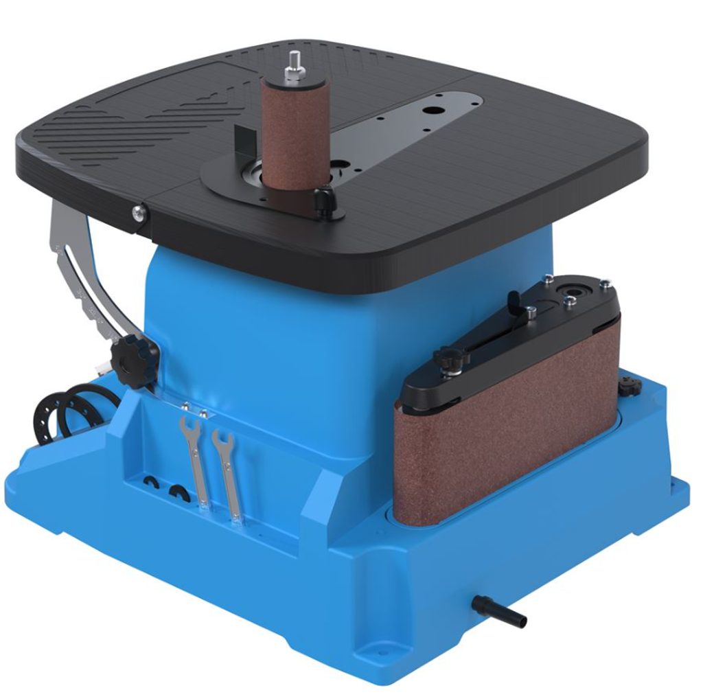 Tato bruska je vybavena funkcí oscilačního broušení, která zajišťuje rovnoměrné a přesné výsledky. Přepínání mezi vřetenovým a pásovým broušením je rychlé a jednoduché, bez nutnosti použití dalšího nářadí. Nastavitelný pracovní stůl s možností náklonu až o 45° umožňuje přesné broušení pod různými úhly. Praktické připojení pro odsávání prachu udržuje pracovní prostor čistý a přehledný, což zvyšuje komfort a bezpečnost při práci.