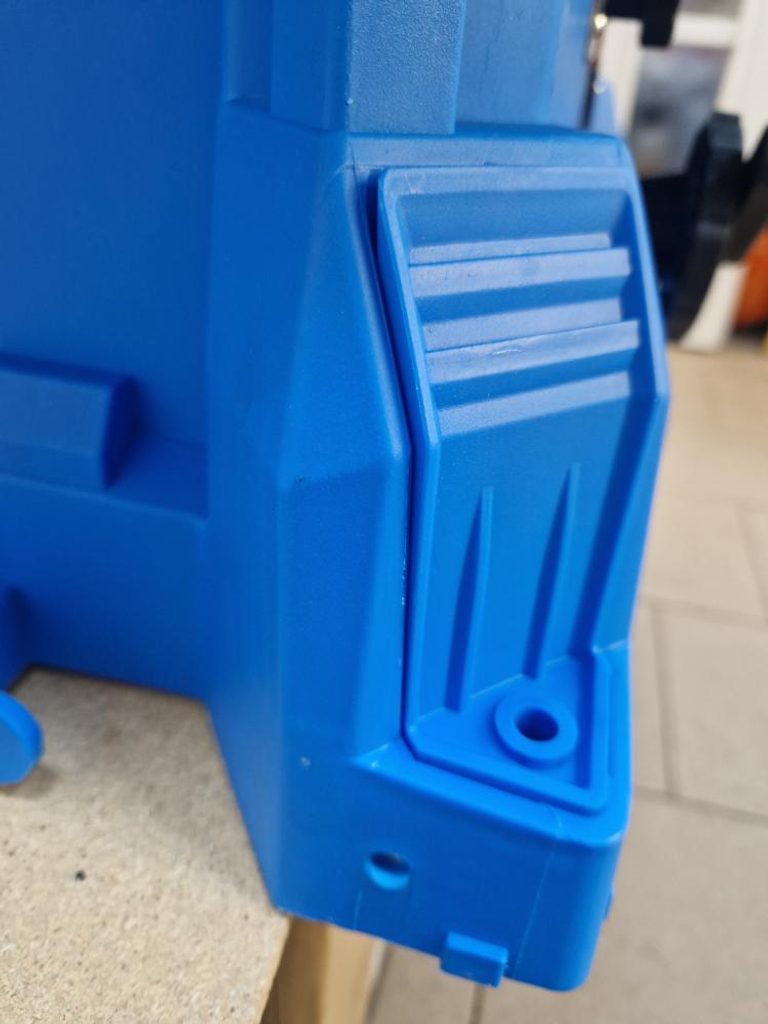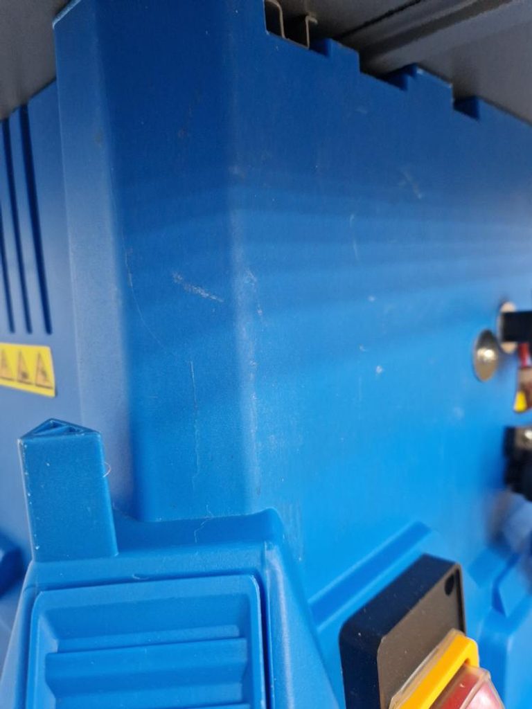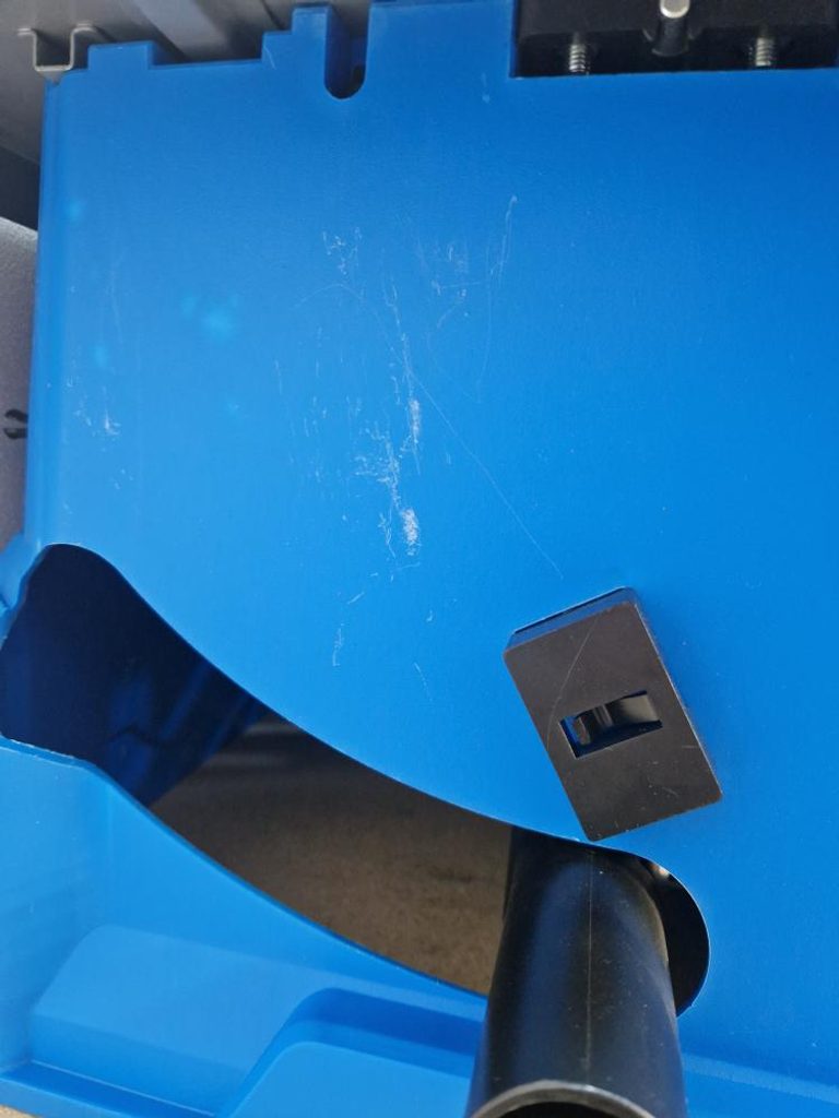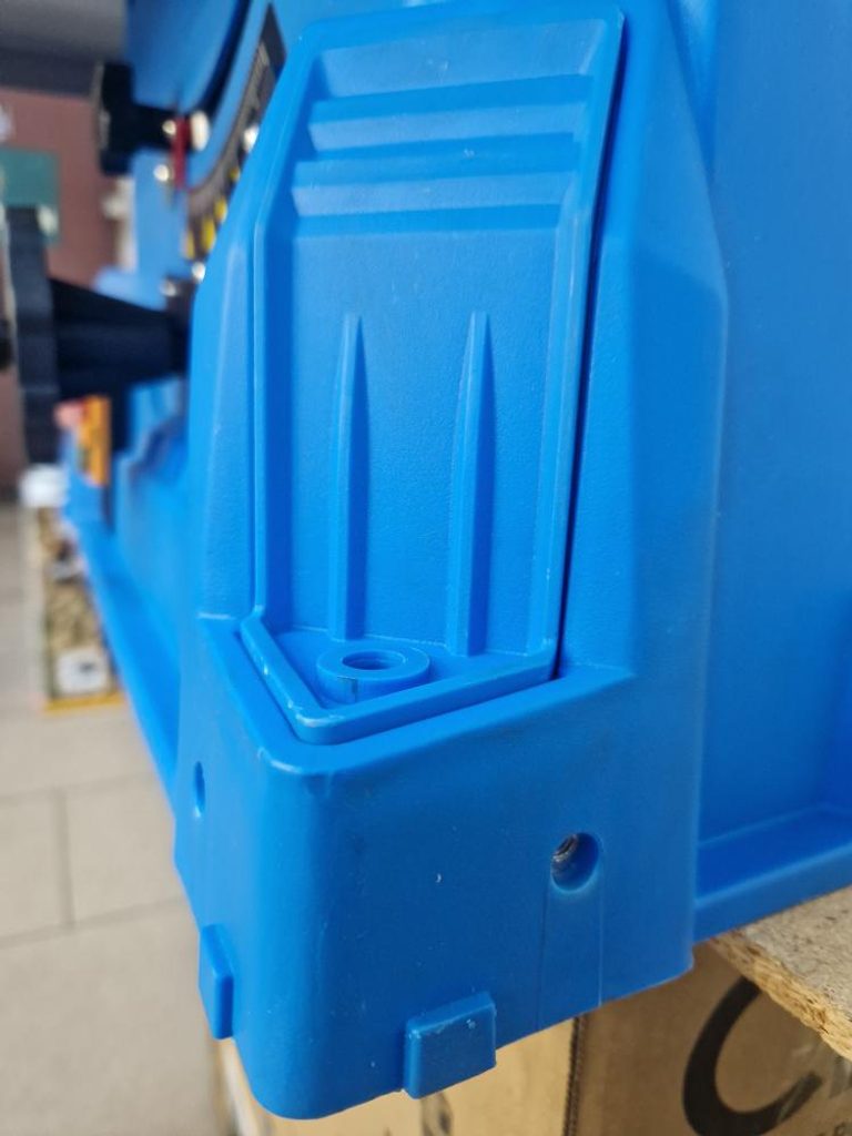 Nová pila, která byla přepravou poškrábána, a ušpiněna, má drobné oděrky povrchu, odlepený kryt nohy, má originální balení vč. návodu a příslušenství.