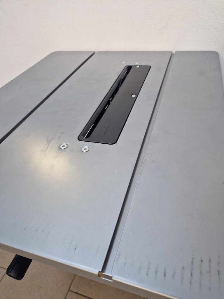 Má plynulé nastavení řezné výšky (úhlu sklonu) pilového kotouče ruční klikou, boční nástavce stolu pro rozšíření pracovní plochy na (až) 925 x 630 mm.