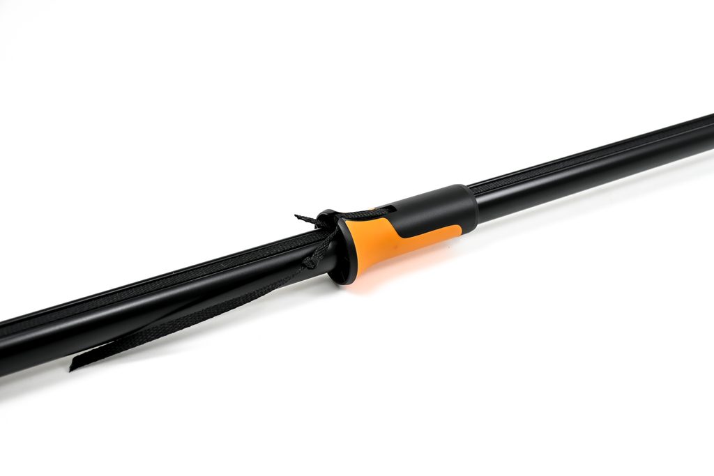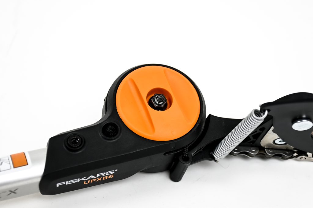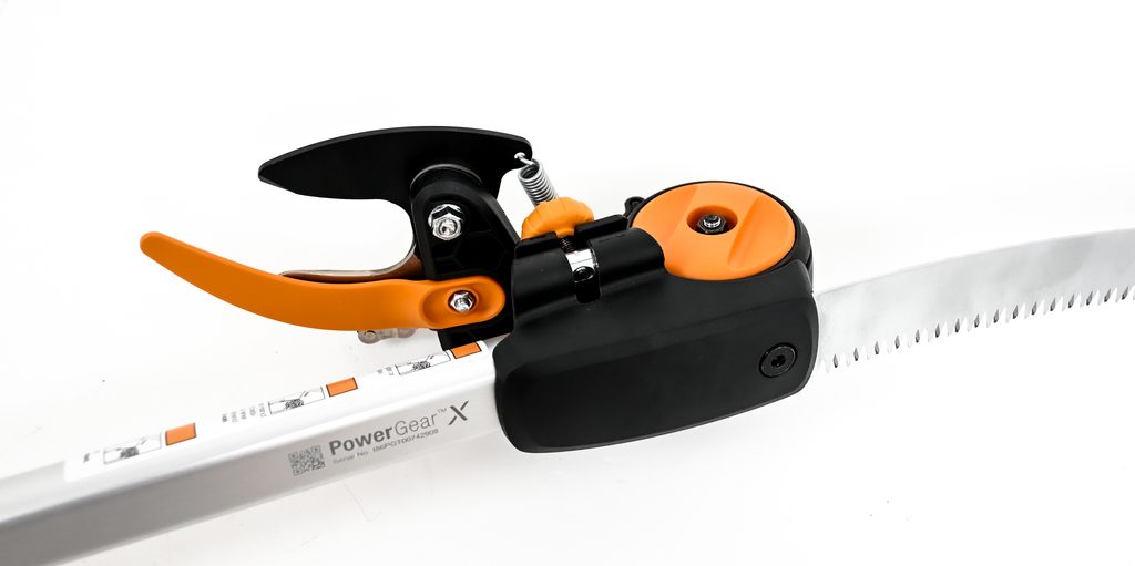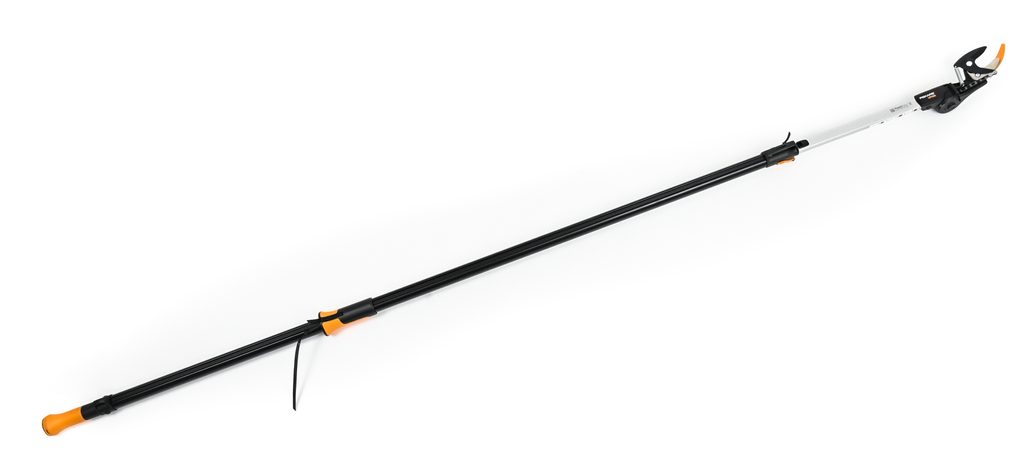 Vysouvací část se povoluje a zajišťuje pomocí oranžové páčky. Střihat je možné v každé její poloze. To znamená, že délku násady předem přizpůsobujeme výšce stromů. Střiháme tak, že jednou rukou uchopíme dole násadu a druhou, po zasunutí větve mezi čepele, zatáhneme za objímku.