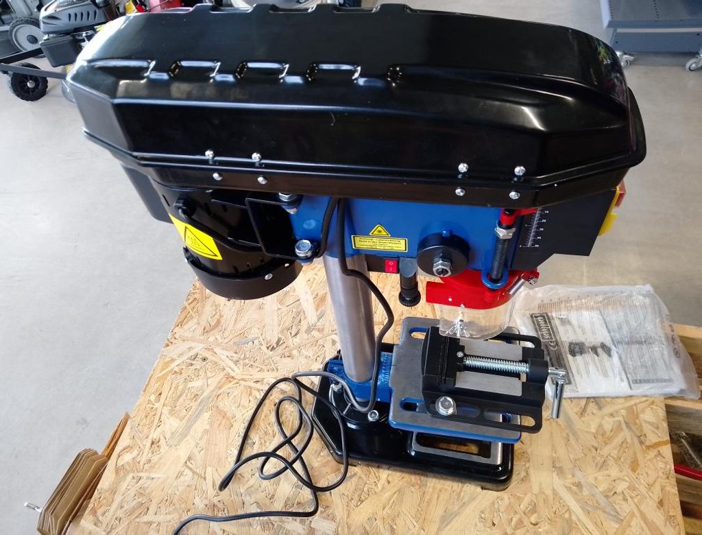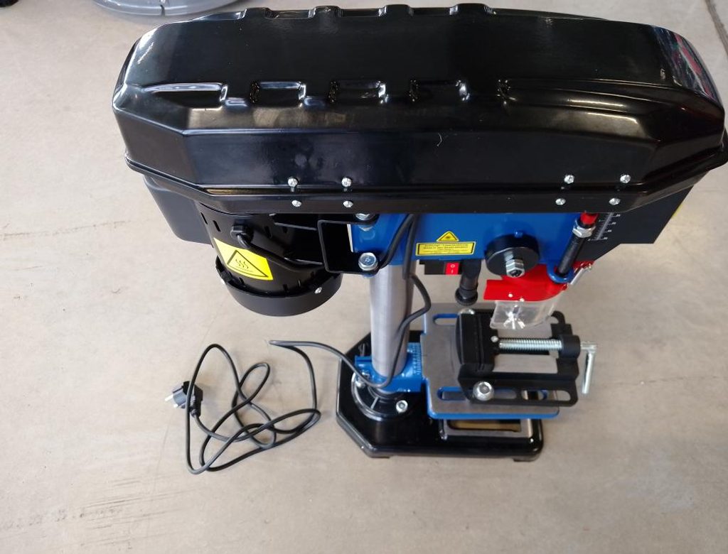 Jednou použitá stojanová vrtačka, byla pouze odzkoušena, má drobné oděrky povrchu, funkční, kompletní příslušenství vč. návodu a originálního balení. Sestavena.