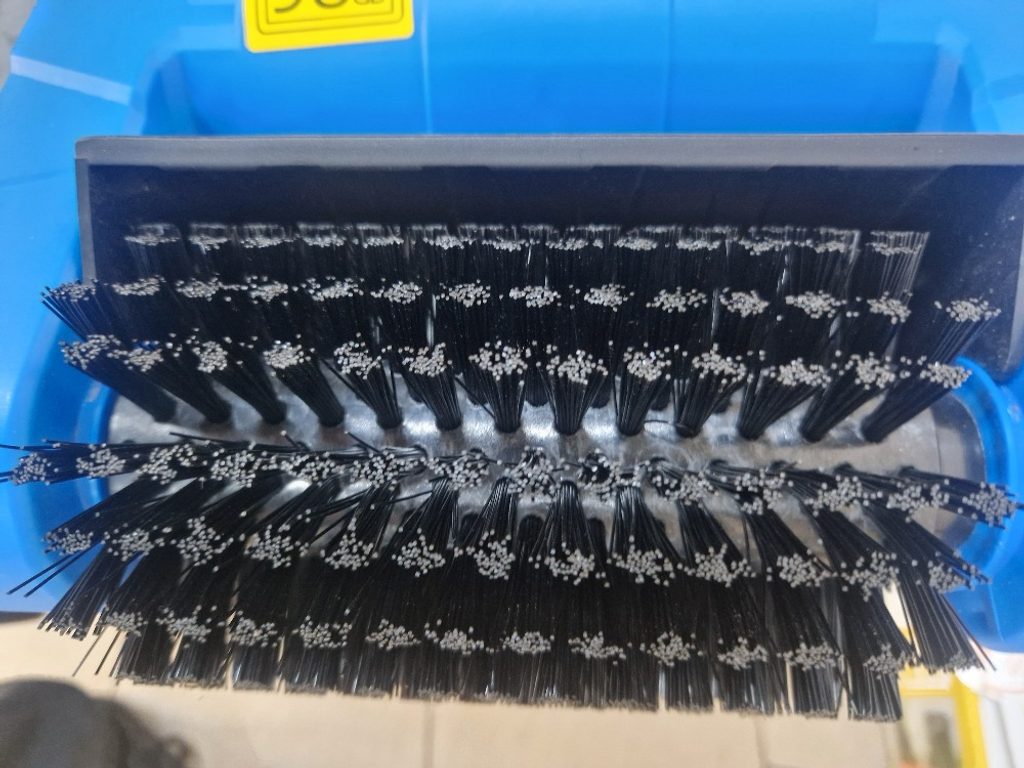 Kartáčový čistič byl použit jedinkrát k odzkoušení, jeden z kotoučů nese známky opotřebení, ostatní jsou nepoužity, stroj má drobné oděrky povrchu, lehce ušpiněn, má originální balení, vč. návodu, kompletní příslušenství, funkční.