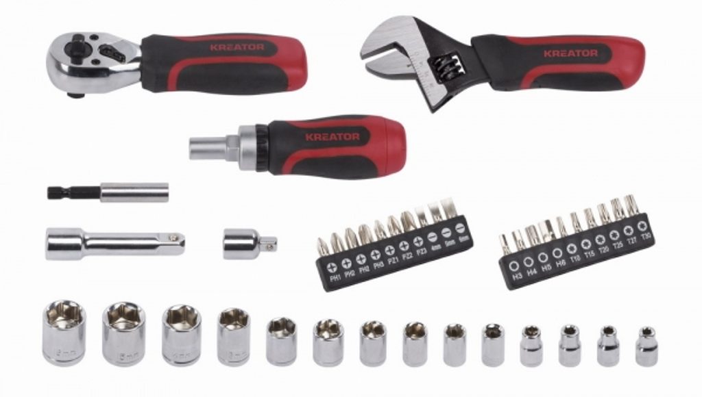 Gola sada Kreator KRT500116 obsahuje 40 ks nářadí s ráčnou 1/4" a 3/8". Sada zahrnuje různé nástrčné hlavice a bity Vyrobeno z chrom-vanadia, které zajišťuje vysokou odolnost a dlouhou životnost. Ideální pro domácí použití i profesionální práci.
