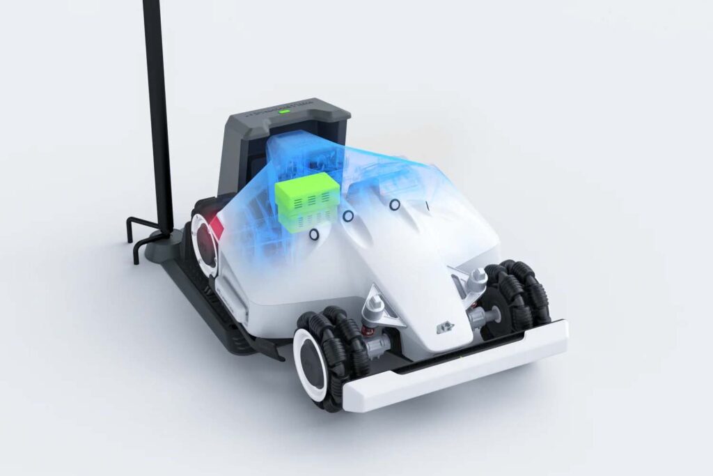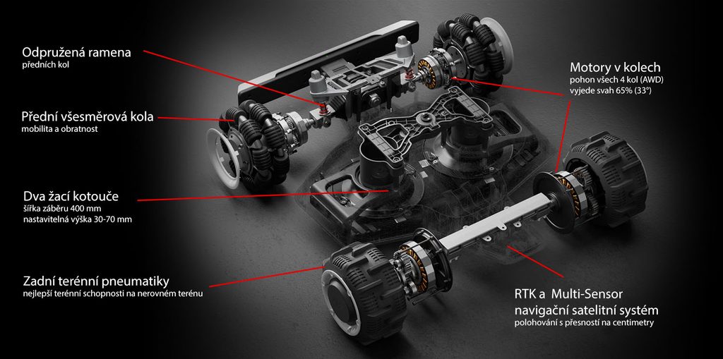 Pohon všech čtyř kol zajišťuje mimořádné terénní schopnosti, snadno zvládne sklony až 75 %. Lze nastavit až 10 zón pro sekání trávy s rozdílnou výškou a frekvencí sečení. Dva žací disky mají celkovou šířku sečení 400 mm. Integrované ultrazvukové senzory umožňují automatické vyhýbání se překážkám. Ovládání a nastavení je jednoduché díky aplikaci.