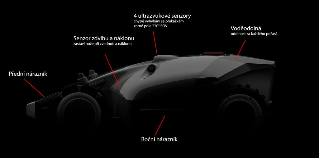 Integrované čtyři ultrazvukové senzory se zorným polem 220 stupňů (FOV) umožňují robotické sekačce LUBA AWD automaticky detekovat a vyhýbat se překážkám o velikosti pouhých 5 cm.