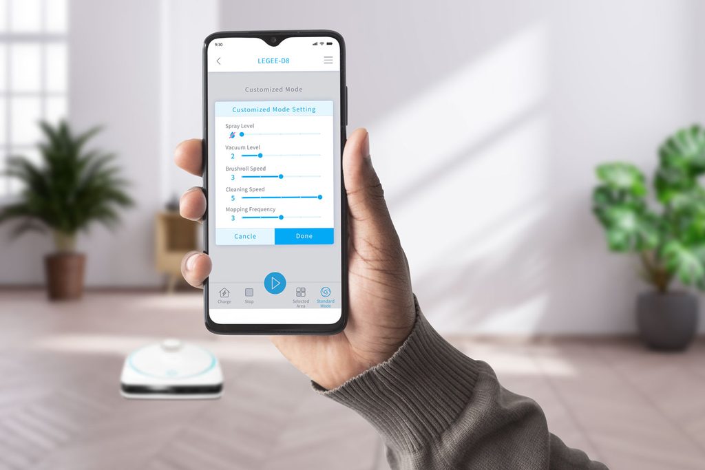 Robota LEGEE D8 můžete pohodlně ovládat prostřednictvím aplikace v češtině. Ta umožňuje sledování úklidu v reálném čase, plánování úklidu, ukládání až pěti map, tvorbu virtuálních bariér a zakázaných oblastí. Můžete upravovat inteligentní rozvržení místností a vybírat z osmi speciálních režimů úklidu. LEGEE podporuje aktualizaci firmwaru přes technologii OTA. Aplikace je dostupná zdarma pro iOS i Android.