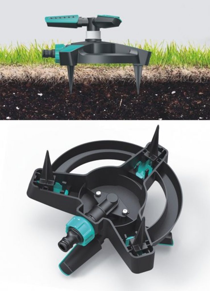 Základna zavlažovače je vybavena výklopnými hroty, což zajišťuje stabilní umístění zařízení. Navíc je zavlažovač vybaven možností připojení na rychlospojku nebo STOP-rychlospojku a je kompatibilní s produkty ROSA.