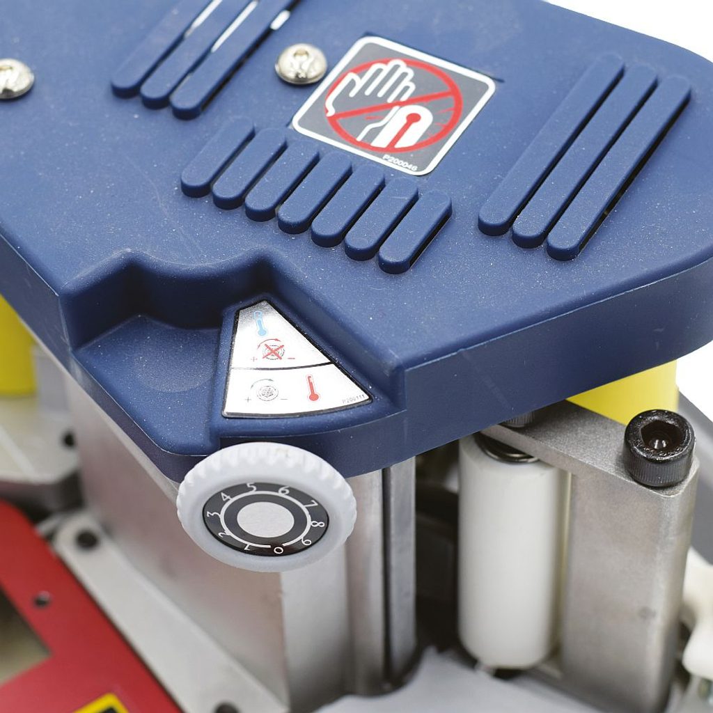 Opěrný vodicí stůl je zespodu opatřen speciální kluznou vrstvou pro lehký posuv po materiálu bez rizika poškrábání a je vybaven měřítkem pro přesné nastavení podle tloušťky desky. Je uložen v masivním držáku s možností naklopení v rozsahu +/-15 °, takže umožňuje přesné olepování i zkosených hran. Rukojeť víka tavné komory lze nastavit do dvou poloh podle konkrétního způsobu olepování.