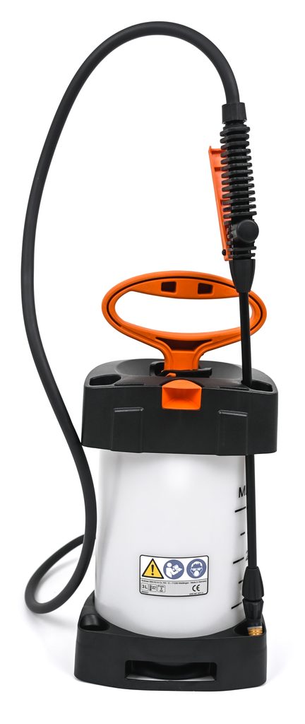 Snadno čistitelný filtr v koleni postřikovače usnadňuje údržbu při výměně trysky. Pro pozastavení stříkání stačí uzavřít ergonomický ventil na 1,3 m dlouhé hadici. K uložení je k dispozici praktický toulec pro uložení trysky.