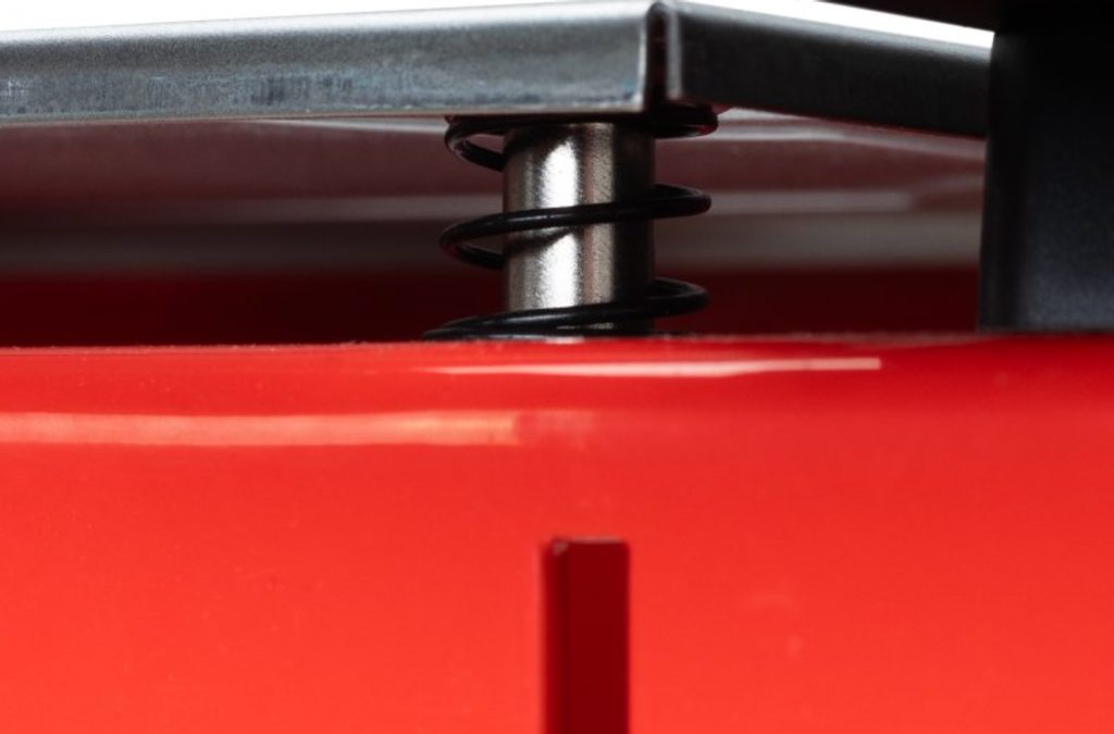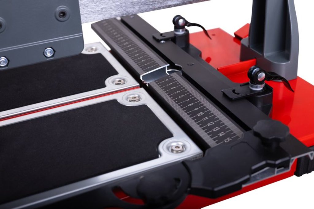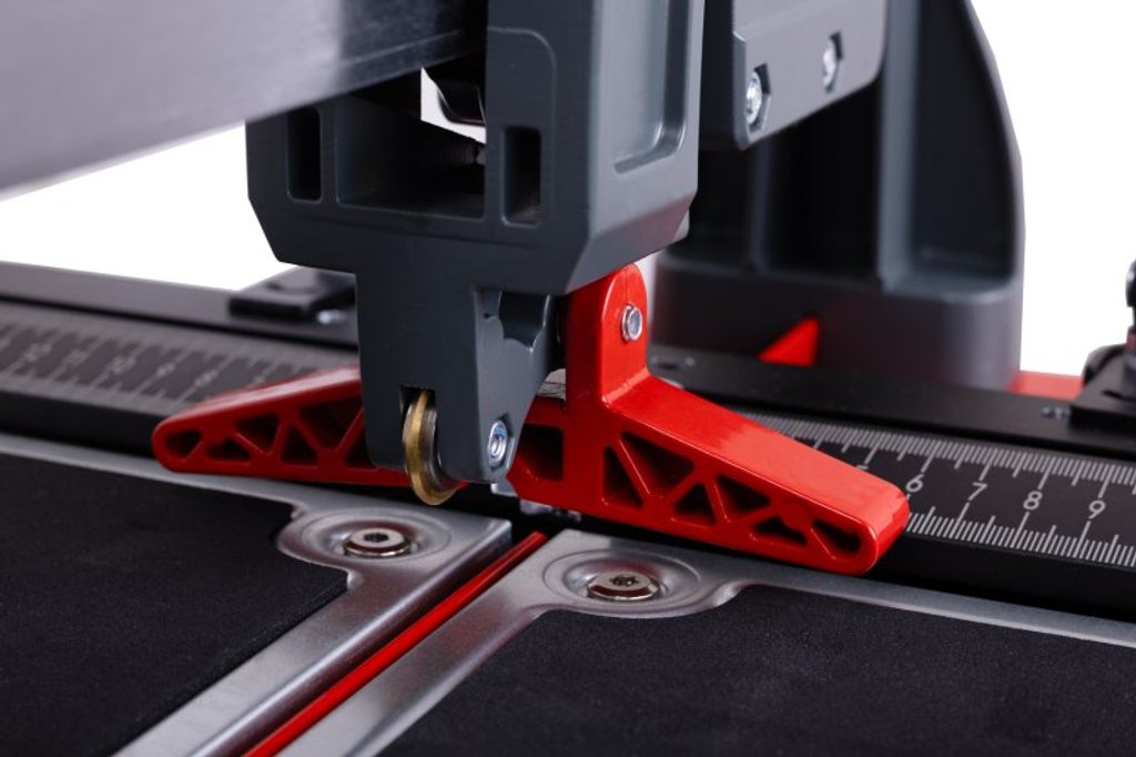 Opěrné desky jsou potažené gumou a uložené na pružinách, což výrazně usnadňuje přesný lom dlaždic. K dispozici je i milimetrové měřítko s úhelníkem a odolným kovovým středem s vybráním, které usnadňuje diagonální řezy. Pro práci s většími formáty oceníte přídavné odpružené boční opěry, jež lze snadno umístit do tří různých pozic.