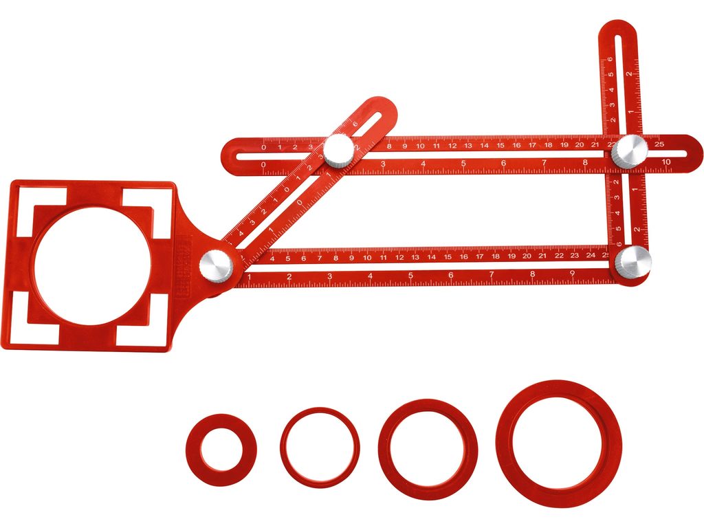 Kovová konstrukce ramen se metrickou stupnicí a kovovými fixačními šrouby bude dobrým pomocníkem v dílně k přenášení nejrůznějších úhlů a pozic. Plastový vícedílný lokátor je potom možno využít pro přesné určení pozice vrtaného otvoru například při obkládání koupelen.