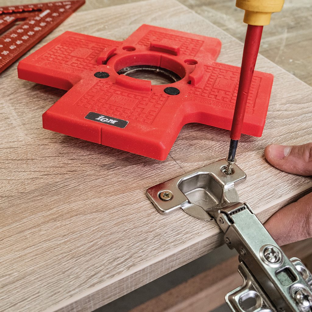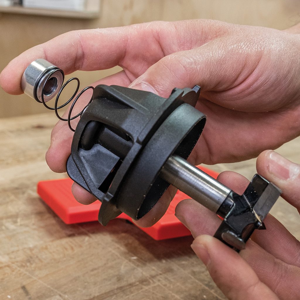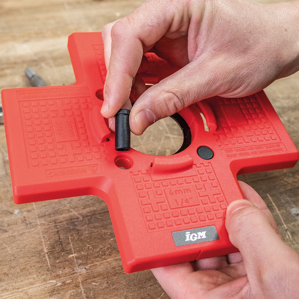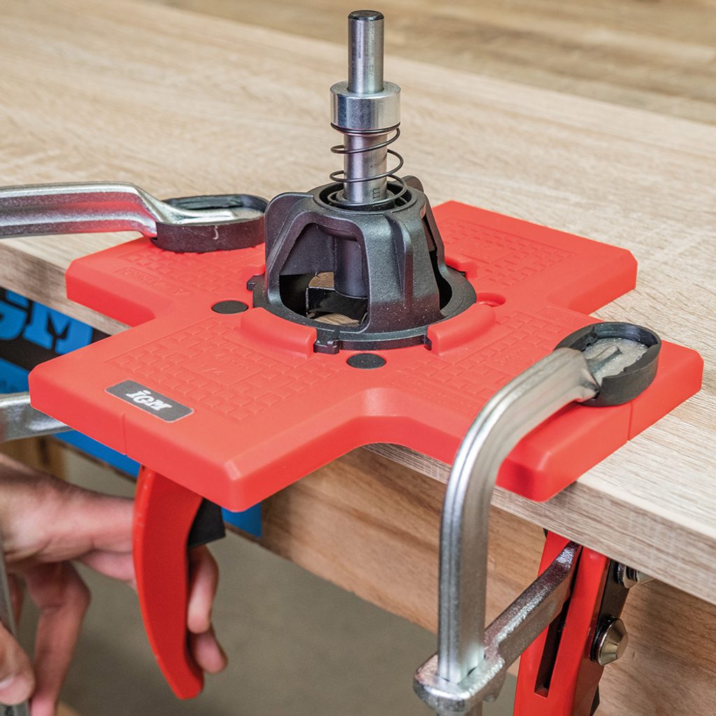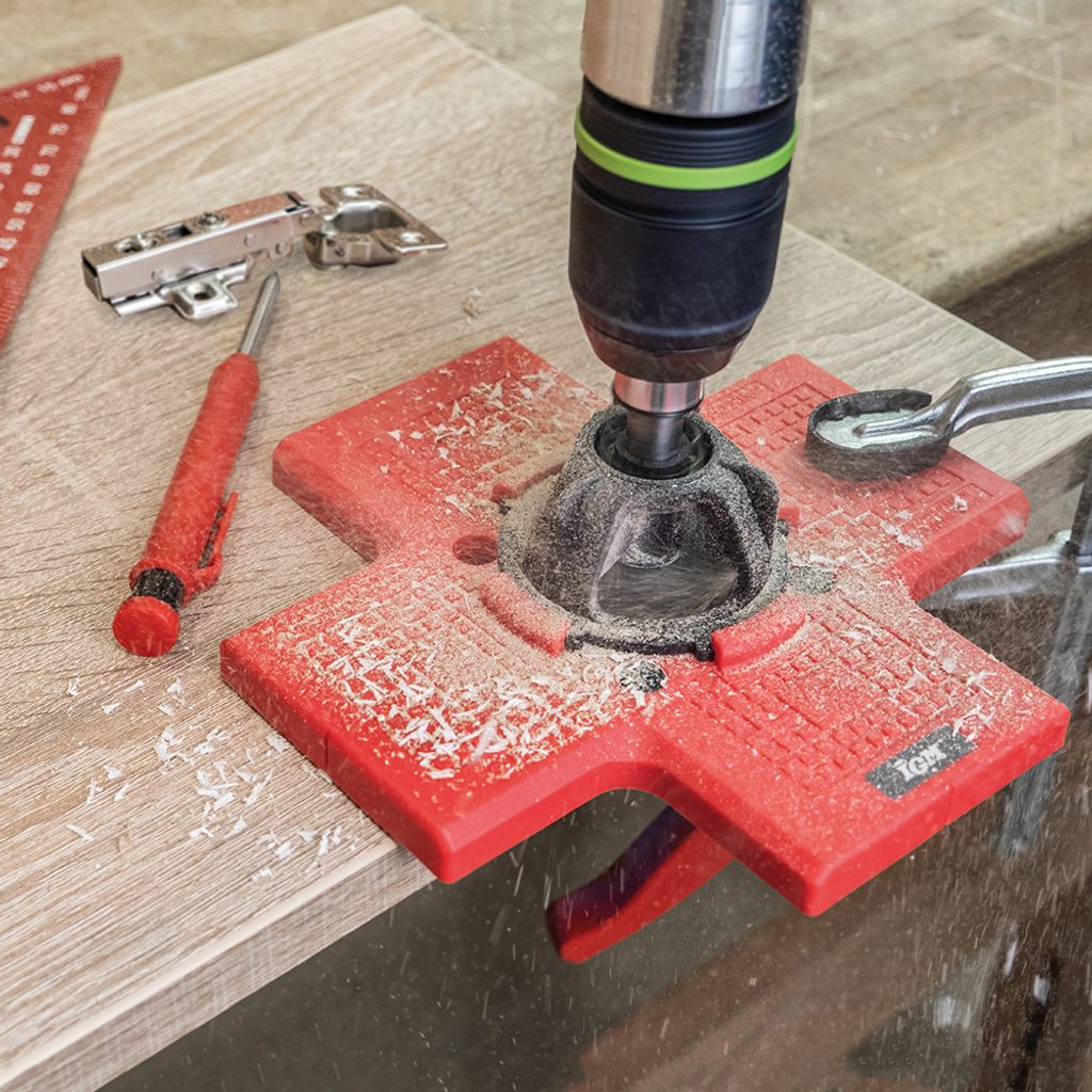Šablona se dodává se sukovníkem 35 mm s válcovou stopkou, který lze upnout do běžné vrtačky. Díky integrovanému hloubkovému dorazu vyvrtáte všechny misky do stejné hloubky, ideálně do materiálu o minimální tloušťce 18 mm.