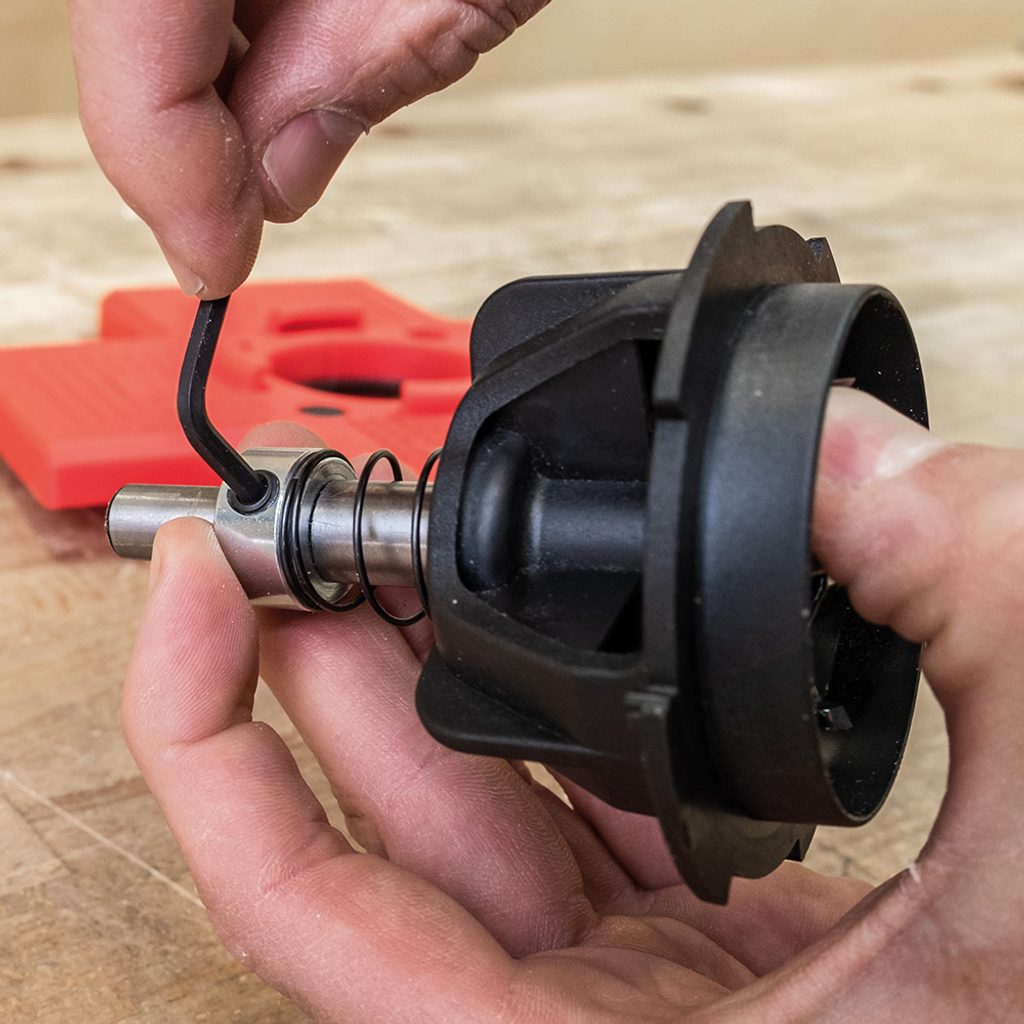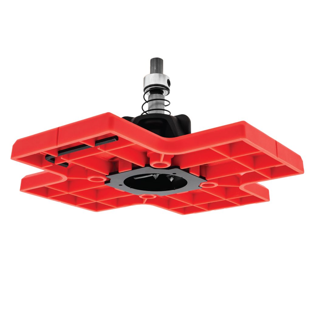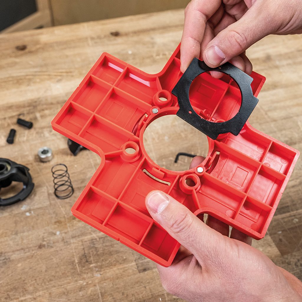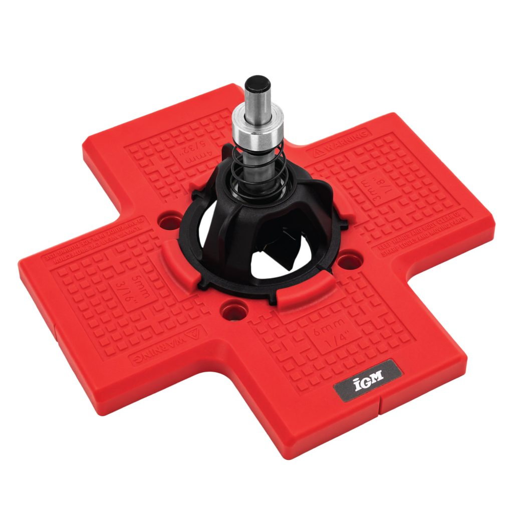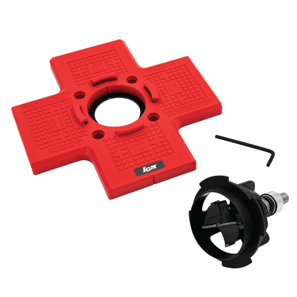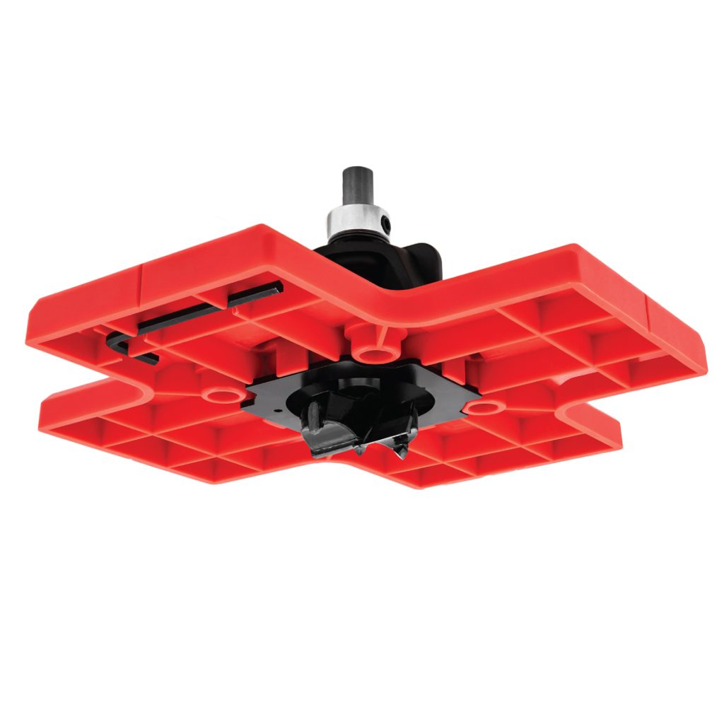 Šablona se dodává se sukovníkem 35 mm s válcovou stopkou, který lze upnout do běžné vrtačky. Díky integrovanému hloubkovému dorazu vyvrtáte všechny misky do stejné hloubky, ideálně do materiálu o minimální tloušťce 18 mm.