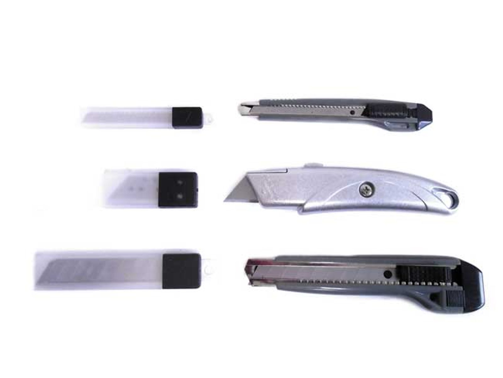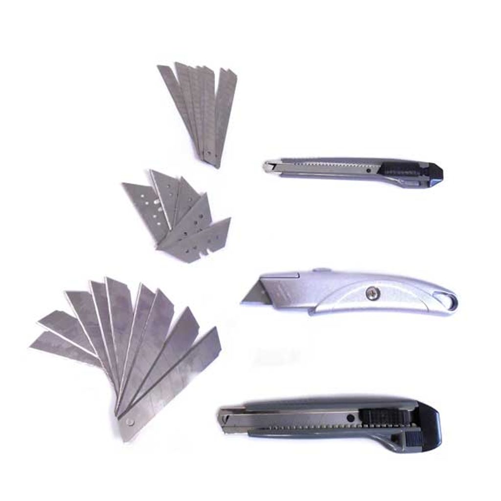 3 nože z hliníkové slitiny. 3 x 10 ks náhradních čepelí k jednotlivým nožům.