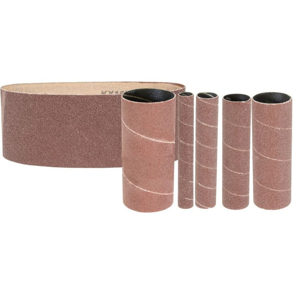 6 dílná sada brusného příslušenství obsahuje 5 ks brusných válečků K80: ø13, ø19, ø26, ø38, ø51 a 1 ks brusný pás K80 100x610 mm.