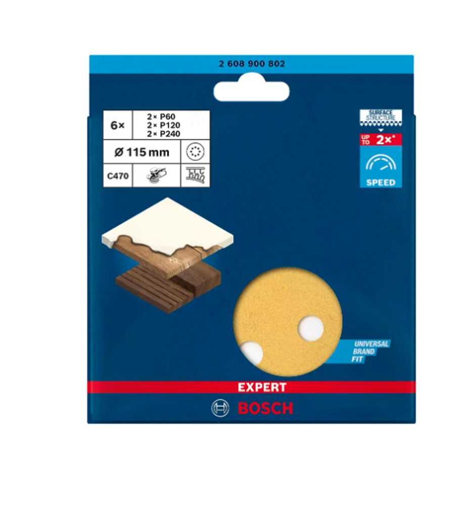 Výjimečný brusný výkon je zajištěn díky Bosch Surface Structure, kde struktura drti vzniká již při výrobě, což umožňuje agresivní úběr materiálu. Optimalizované rozmístění brusných zrn navíc podporuje vysokorychlostní broušení, díky čemuž je brusný papír EXPERT C470 až 2× rychlejší než standardní brusný papír Bosch C420.