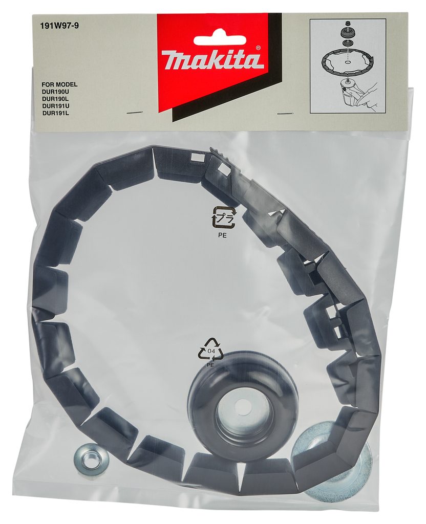 Sada dílů pro uchycení vyžínacího nože Makita 191W97-9 je speciálně navržena pro modely křovinořezů Makita DUR190, DUR191 a DUR368A, což zajišťuje snadnou instalaci a pevné uchycení vyžínacího nože.