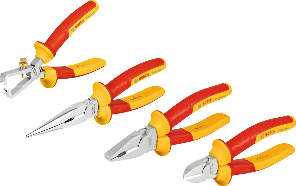 Sada kleští Bosch 1600A02NG1, výkonnostní třídy Bosch PRO, je 4dílná výbava pro elektrikářské práce, montáže a servis. Obsahuje izolované VDE nástroje pro uchopení, stříhání i odizolování vodičů, navržené pro pohodlné a jisté ovládání.