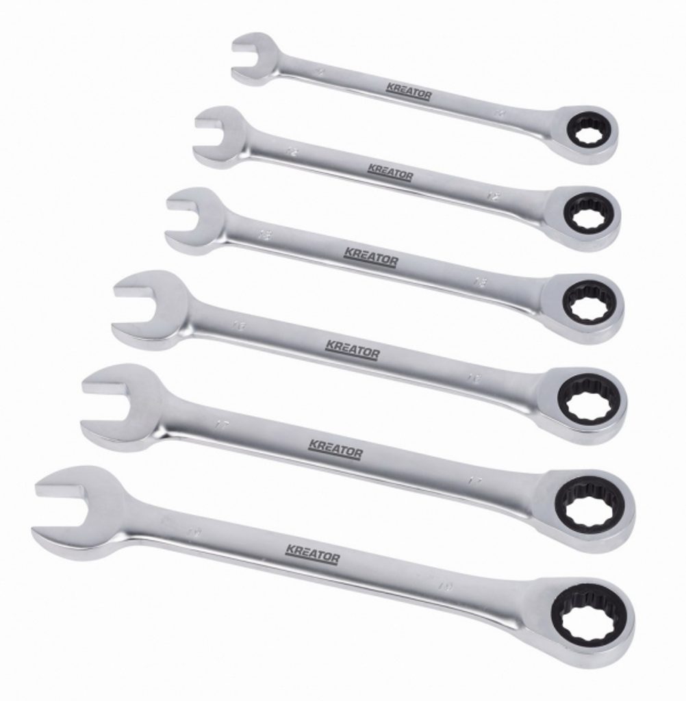 Sada očkoplochých klíčů Kreator KRT500013 vybavených ráčnou, která umožňuje utahování a povolování matic, aniž by bylo nutné klíč sundávat a znovu nasazovat po každém otočení. To zvyšuje efektivitu práce, zejména v těsných prostorech, kde je obtížné provádět plné otočky.