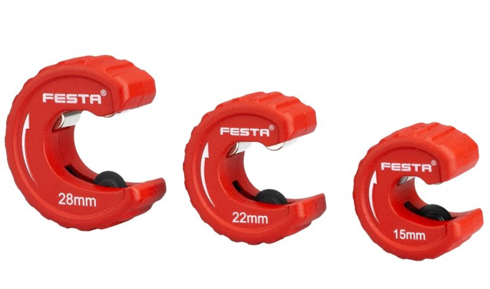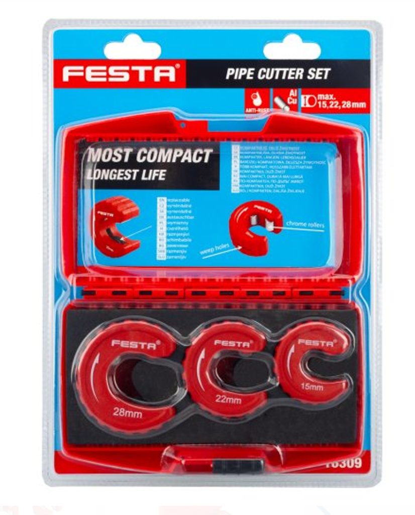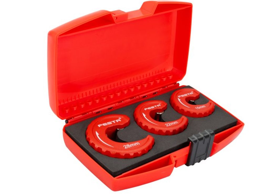 Sada kotoučových řezaček na trubky FESTA 16309 obsahuje tři řezačky určené pro přesné a čisté řezání trubek o průměru 15, 22 a 28 mm. Tento praktický set je ideální pro práci s měděnými, hliníkovými i tenkostěnnými ocelovými trubkami. Každá řezačka je navržena tak, aby umožnila snadné a rychlé řezání i na méně přístupných místech, což ocení jak profesionálové, tak domácí kutilové.