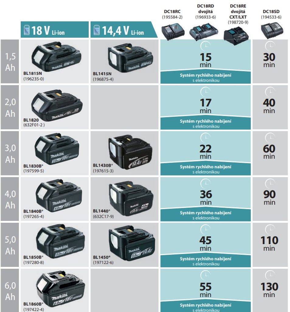 Rychlonabíječka DC18RC je navržena pro nabíjení Li-ion akumulátorů typu LXT 14,4V - 18V a Ni-MH 7,2 až 14,4V, což zajišťuje kompatibilitu s širokou škálou Makita nástrojů.