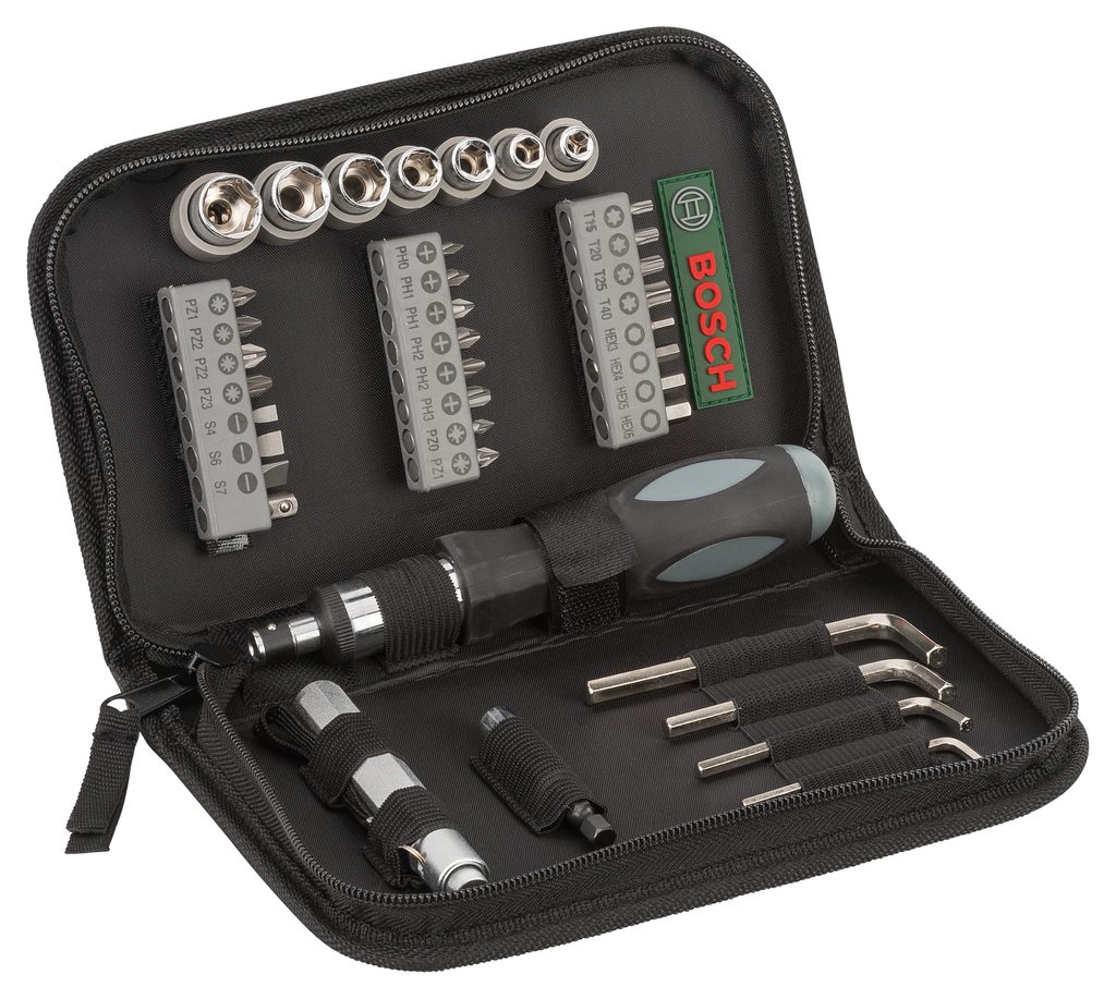 Sada nářadí obsahuje 23 odolných šroubovacích nástavců s délkou 25 mm pro všechny běžné typy a rozměry šroubů. 1 univerzální magnetický držák pro rychlou výměnu bitů a pro spolehlivé uchycení šroubu v bitu.