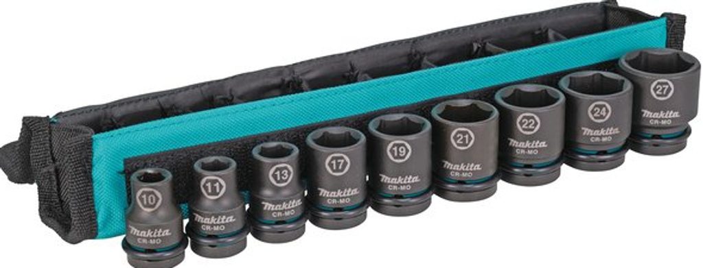 Sada nástrčných klíčů Makita E je vysoce kvalitní sada s 1/2" čtyřhranem a technologií Impact BLACK, která obsahuje 8 dílů.