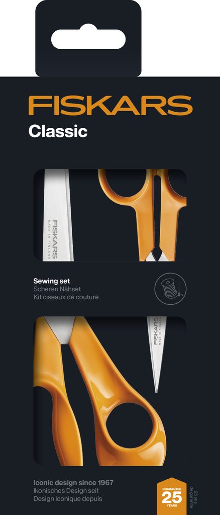 Sada nůžek na šití Fiskars Classic 1082398 obsahuje univerzální nůžky 21 cm a vyšívací nůžky 13 cm. Je určená pro přesné stříhání textilu i drobné, detailní práce nejen při šití.