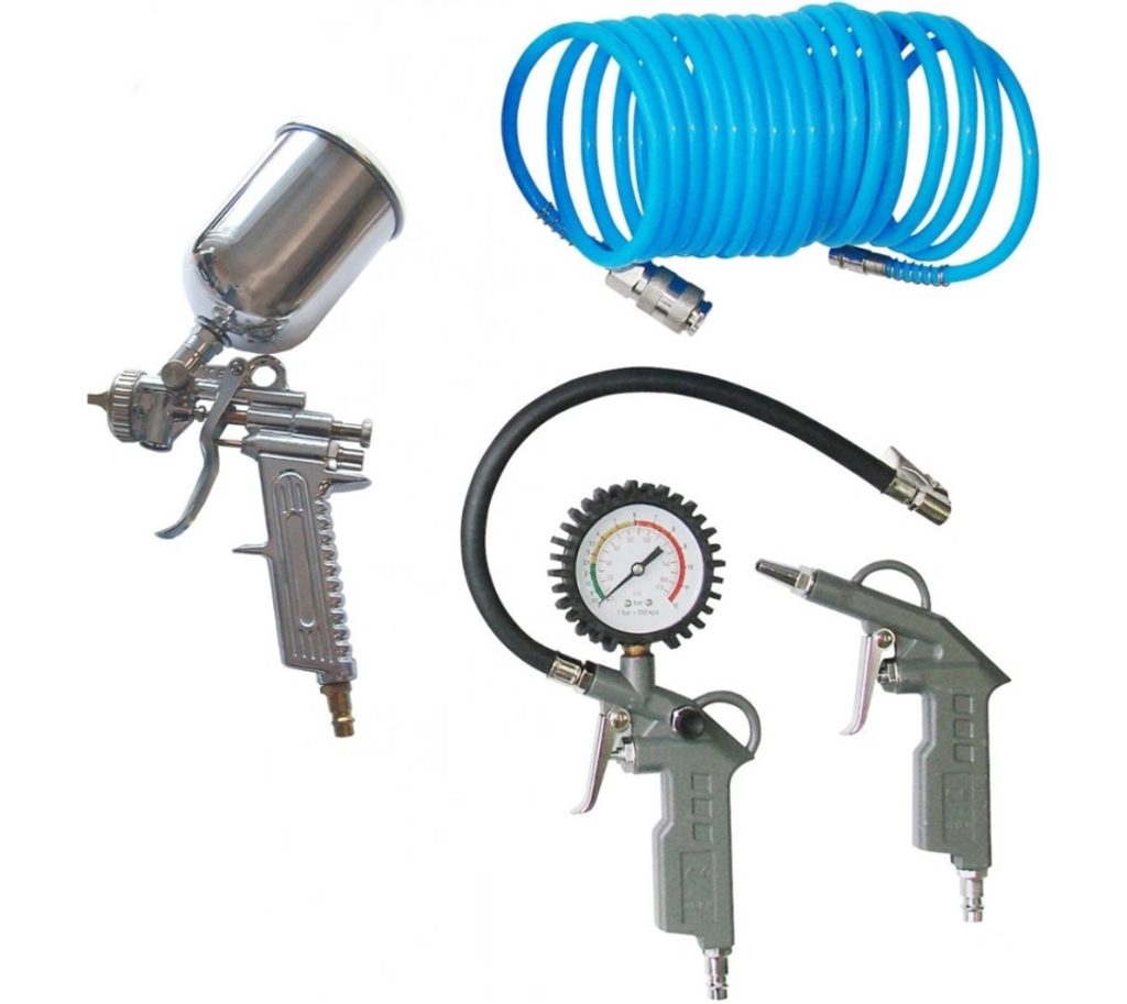 Obsahuje stříkací pistoli s vrchní nádobkou, která je ideálním nástrojem pro nanášení barev a laků. Díky vrchní nádobce umožňuje přesné a rovnoměrné nanášení nátěrových hmot na různé povrchy. Dále je součástí hustilka pneumatik, která je nezbytnou pomůckou pro kontrolu a údržbu správného tlaku v pneumatikách a umožňuje snadné a rychlé plnění pneumatik stlačeným vzduchem. Ofukovací pistole je praktickým nástrojem pro ofukování nečistot a prachu pomocí stlačeného vzduchu, a je vhodná pro čištění pracovních ploch, nástrojů a dalších předmětů.