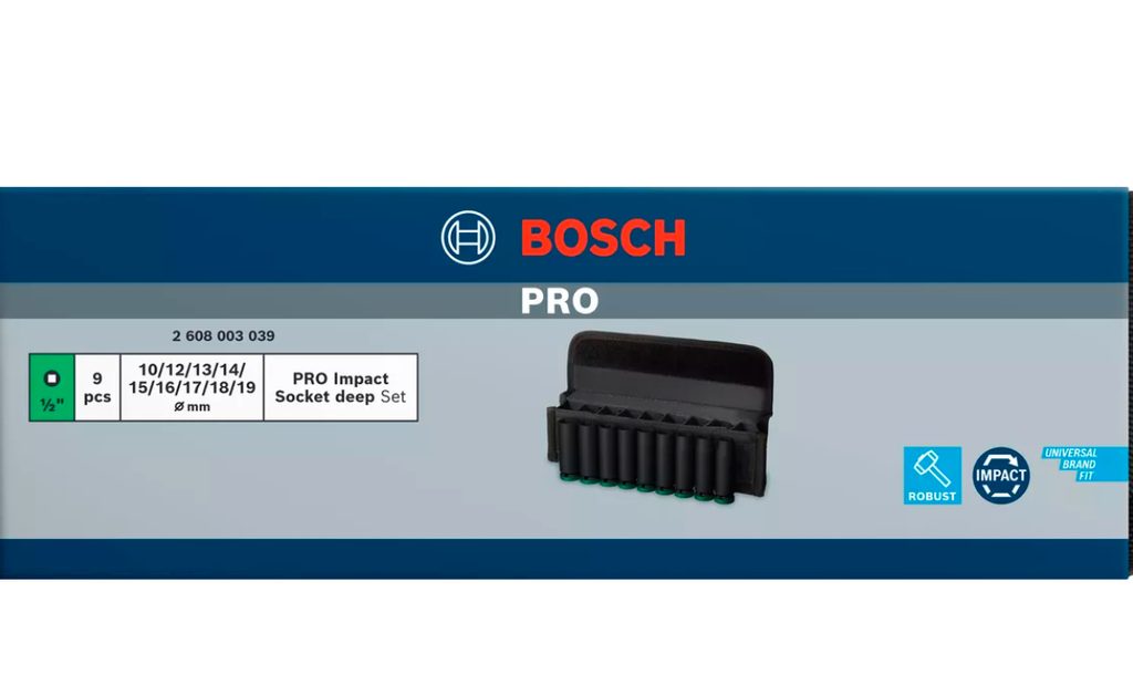 Sada prodloužených nástrčných hlavic Bosch Impact výkonnostní třídy PRO je ideálním nástrojem pro práci s šestihrannými šrouby a maticemi, kdy se používá rázový utahovák se čtyřhranným upínáním. Tato sada byla navržena tak, aby usnadňovala šroubování při stavbě závodů a práci v oborech těžkého průmyslu.