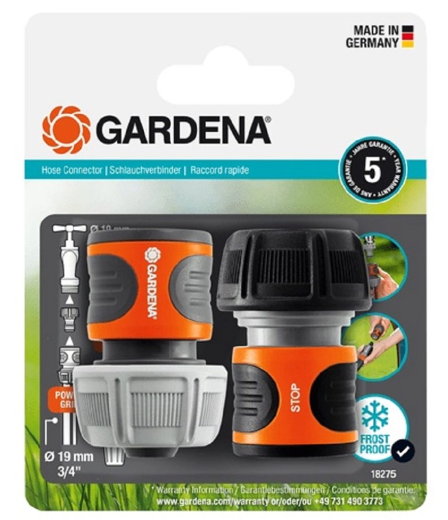Tato sada Gardena 19mm (3/4”) obsahuje rychlospojku pro připojení na začátek hadice a stopspojku, která se připevňuje na konec hadice. Pro snadné rozlišení jsou spojky barevně odlišeny: světlá barva označuje začátek hadice, tedy připojení na kohoutek, zatímco tmavá barva signalizuje, že spojka patří na konec hadice.