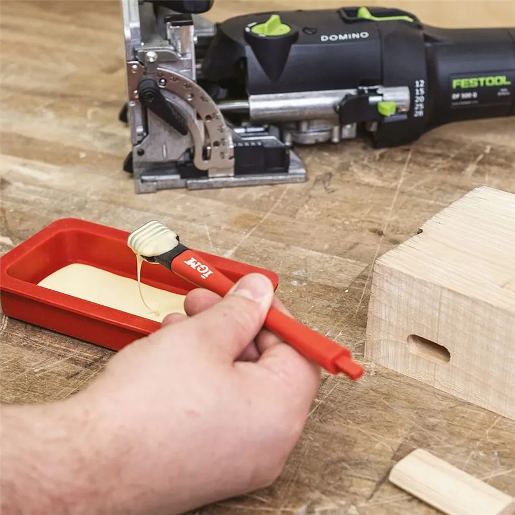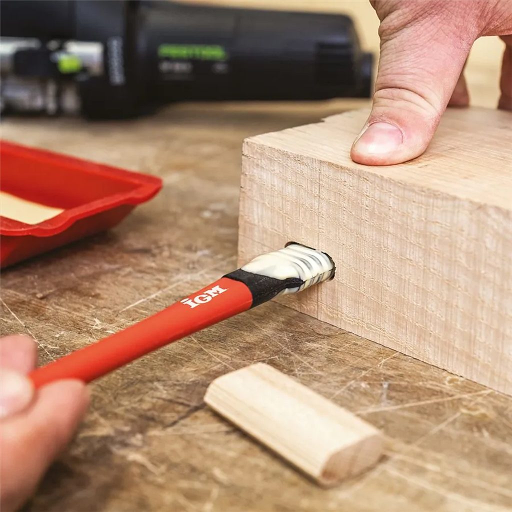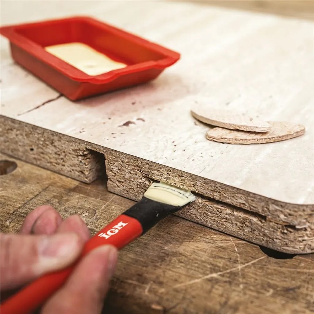 Sada silikonových aplikátorů IGM zajistí přesné a čisté nanášení lepidla do všech typů dřevěných spojů. V balení najdete silikonovou vaničku na lepidlo do které pohodlně nalijete potřebné množství lepidla. Po dokončení práce můžete přebytečné lepidlo vrátit zpět do původní nádoby pomocí prohlubní na straně vaničky. Tyto prohlubně zároveň slouží jako praktické opěrky, abyste si během práce neznečistili pracovní plochu – můžete o ně odkládat štětce či aplikátory.