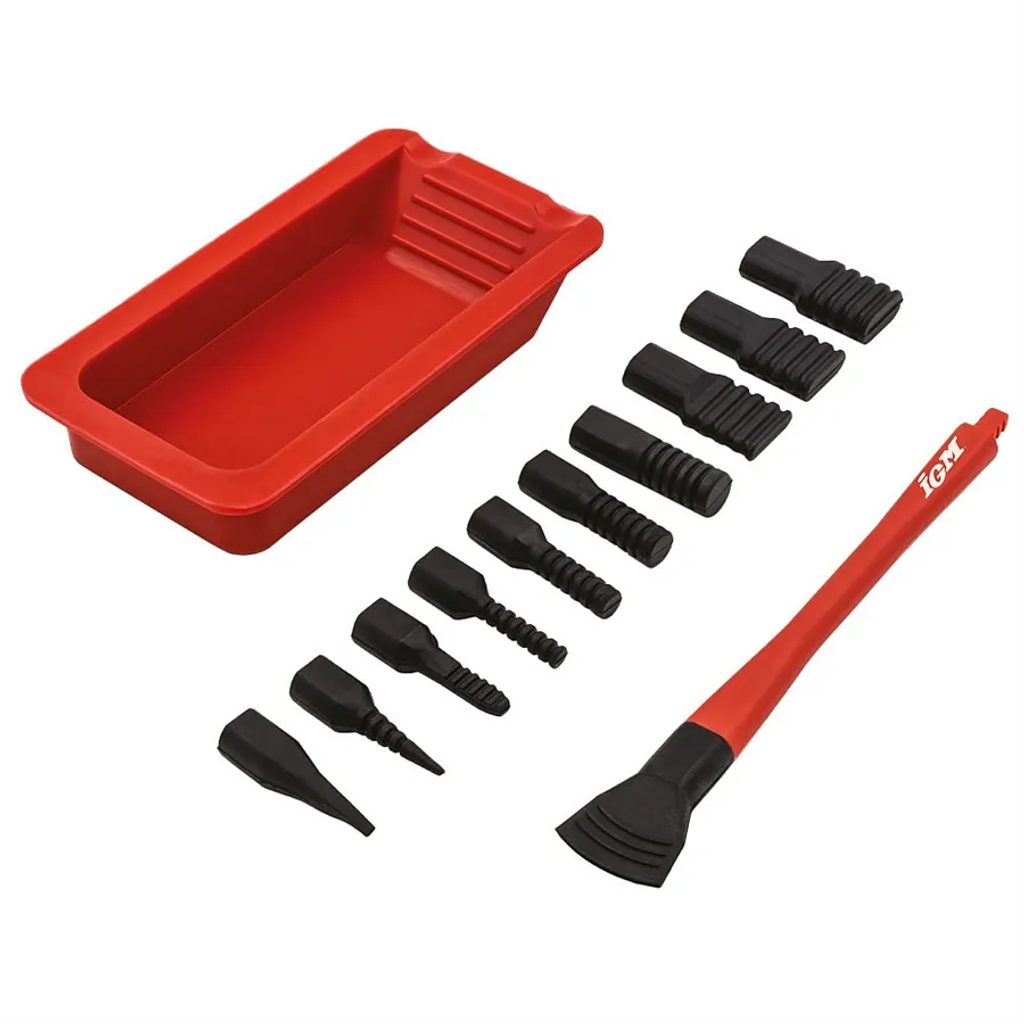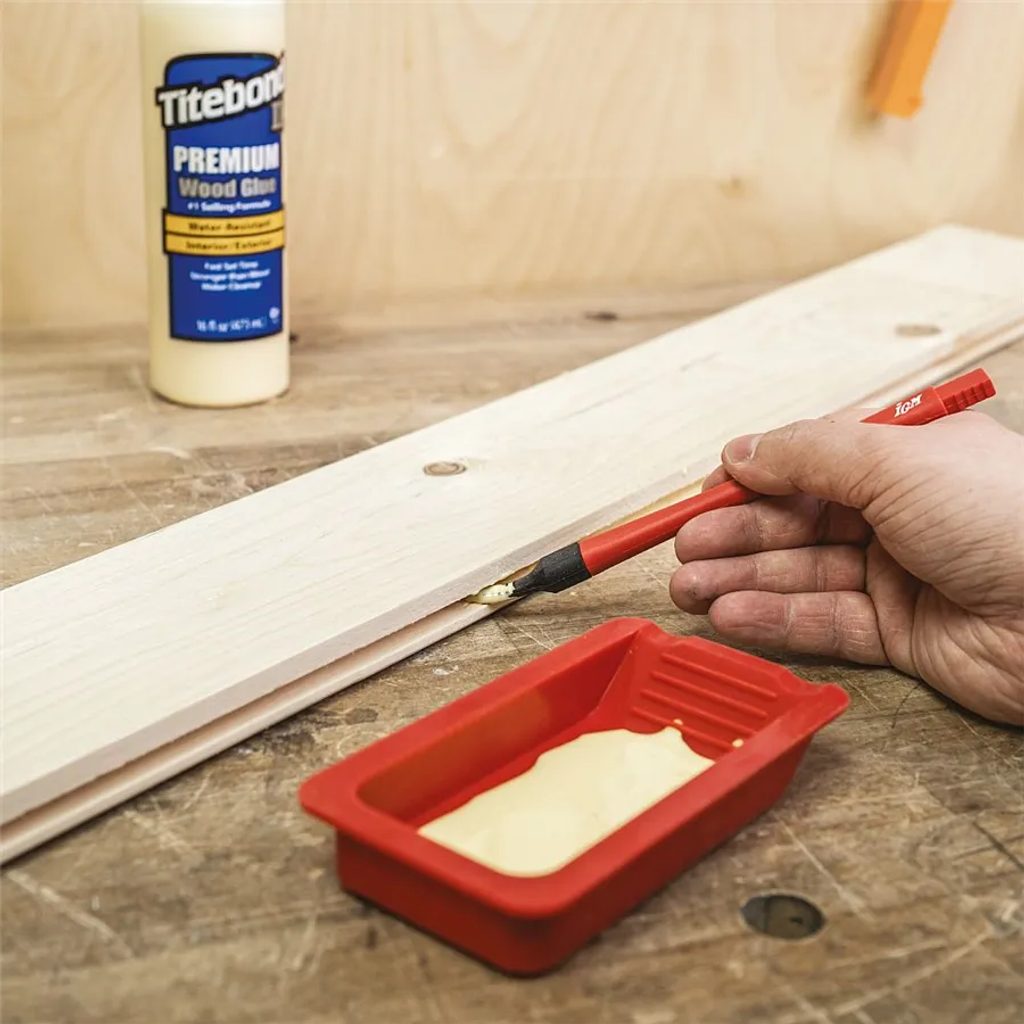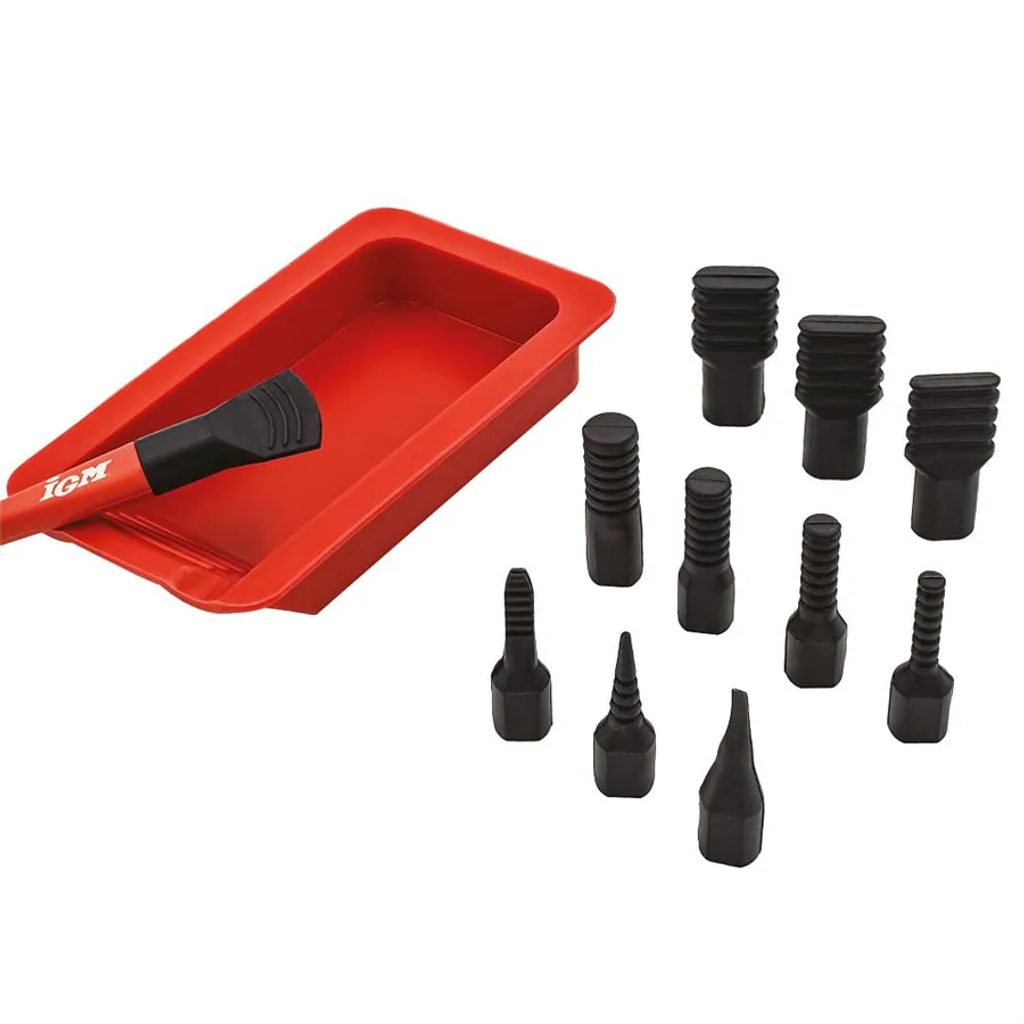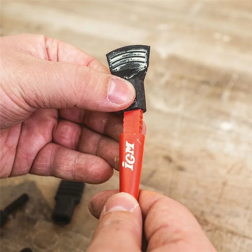 Sada silikonových aplikátorů IGM zajistí přesné a čisté nanášení lepidla do všech typů dřevěných spojů. V balení najdete silikonovou vaničku na lepidlo do které pohodlně nalijete potřebné množství lepidla. Po dokončení práce můžete přebytečné lepidlo vrátit zpět do původní nádoby pomocí prohlubní na straně vaničky. Tyto prohlubně zároveň slouží jako praktické opěrky, abyste si během práce neznečistili pracovní plochu – můžete o ně odkládat štětce či aplikátory.