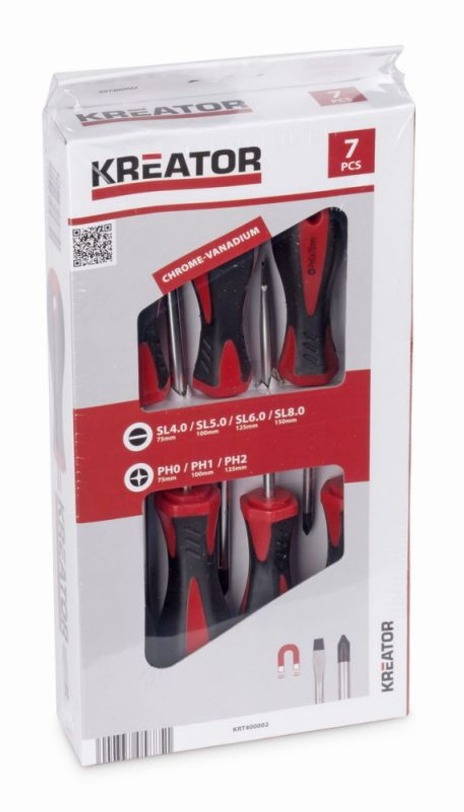 Praktická sada šroubováků KREATOR obsahuje 7 kusů šroubováků s plochými (SL) a křížovými (PH) hroty. Všechny šroubováky jsou vyrobeny z kvalitní chrom-vanadiové oceli (Chrome vanadium), která zaručuje vysokou pevnost a dlouhou životnost nářadí.