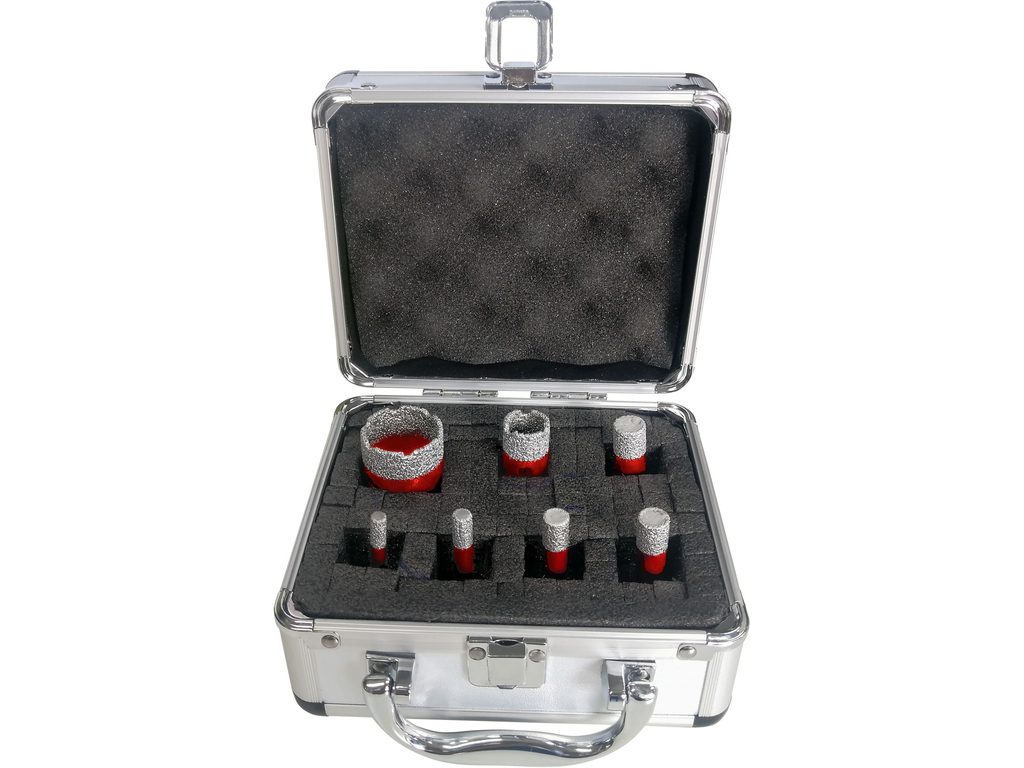 Diamantové vrtací korunky slouží k vyvrtání otvorů do dlažby a jiných obkladových materiálů pomocí úhlové brusky. Sada korunek je balena v praktickém kufříku. Korunky lze používat i bez chlazení.