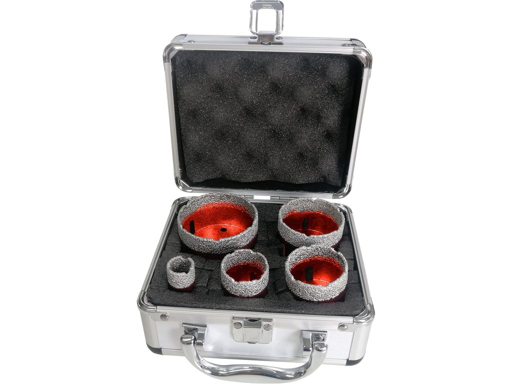 Diamantové vrtací korunky slouží k vyvrtání otvorů do dlažby a jiných obkladových materiálů pomocí úhlové brusky. Sada korunek je balena v praktickém kufříku. Korunky lze používat i bez chlazení.