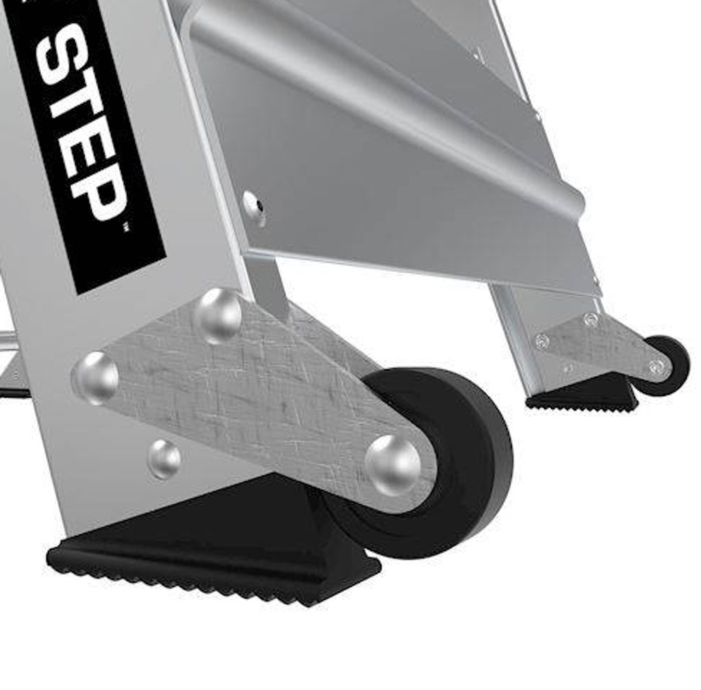 Praktické široké pogumované nožičky umožňují bezpečnou práci i na roštech a površích, kde by běžné úzké nožičky mohly uvíznout. Pro snadnou manipulaci jsou schůdky vybaveny integrovanými kolečky.